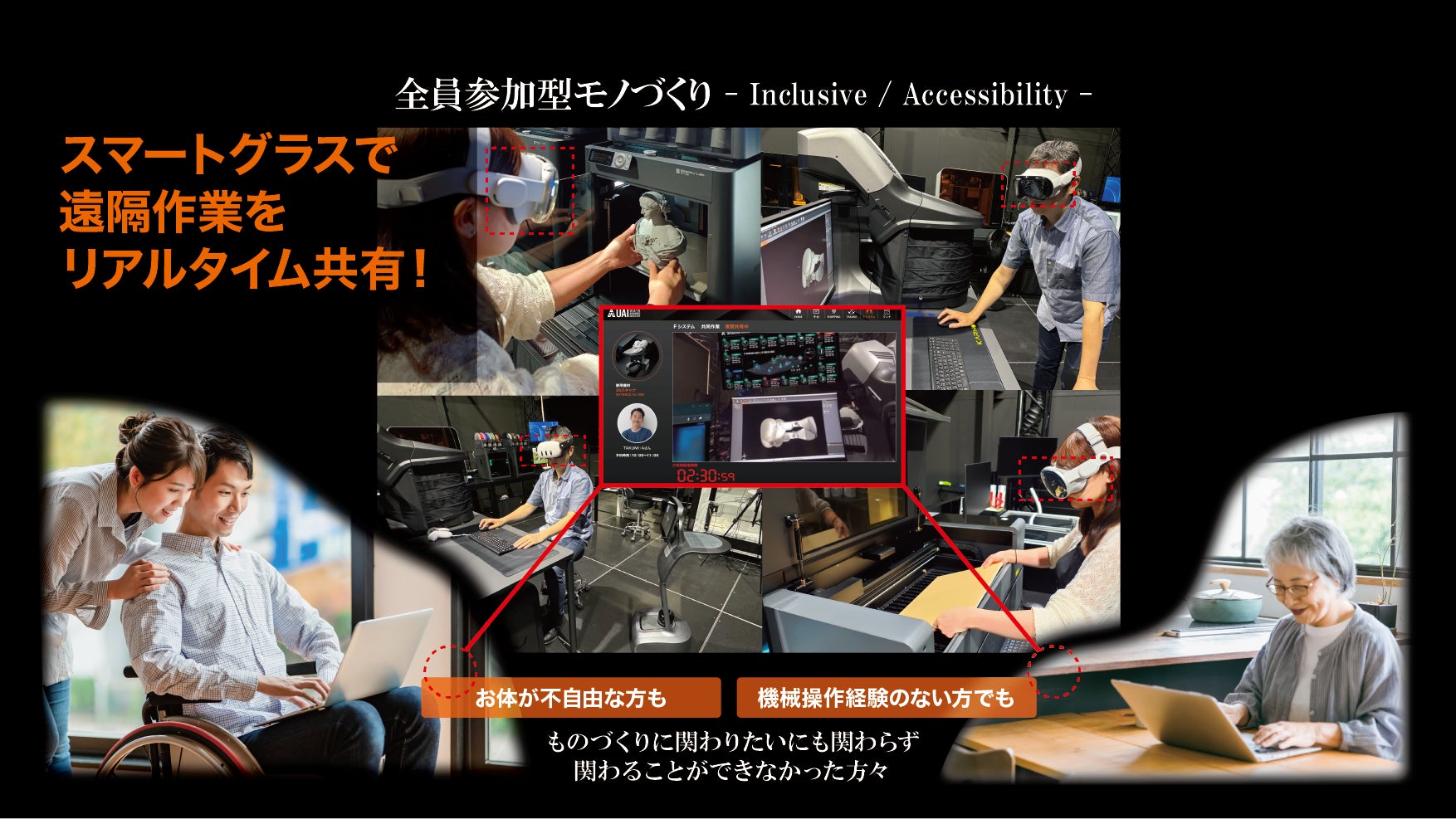 UAIは、AIとXR技術とスマートグラスを活用し、次世代の技能伝承とものづくりを支援する革新的なデジタルシェア工房です。この施設は、築50年の10年以上使用されておらず放置されていた倉庫を再生、先端技術をとりいれた空間として、遠隔地からでも作業が可能な「遠隔ものづくりシステム」や、AIを活用した「技能伝承システムSHUGI」を構築しました。