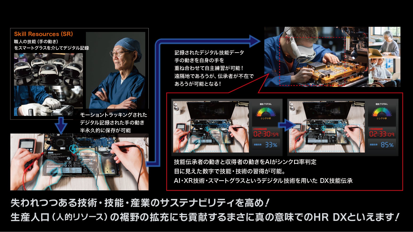 これは熟練者の手の動きをXR技術で記録し、訓練生がその手の動きなぞることでの学習を可能にしています。さらにAIが学習精度を評価することで、効率的かつ正確な技能の継承が実現します。 この仕組みは、地理的な制約を超え、多様な人々が技能を学び、参加できる包括的な環境を提供します