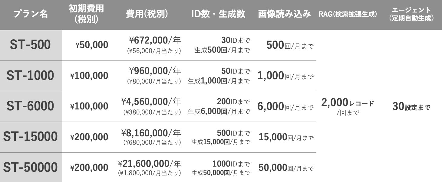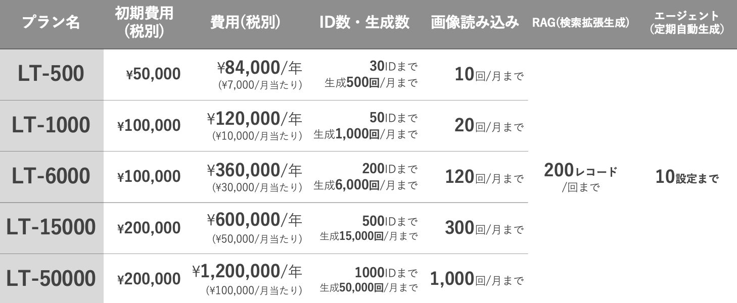 この機能により、あらかじめ設定したプロンプト(指示)に基づき、本サービスが週次や月次でkintoneのレコード※を自動作成することが可能となります。日々の情報収集や月次の営業レポート作成などのルーティンタスク遂行をアシストし、業務効率化・自動化に貢献します。また同時に、月当たり7,000円から、月間500回AI生成をご利用いただけるライトプラン(LT-500)・スタンダートプラン(ST-500)を新たに追加し、お客様のご利用規模・ニーズに合わせた幅広いプラン選択が可能となりました。