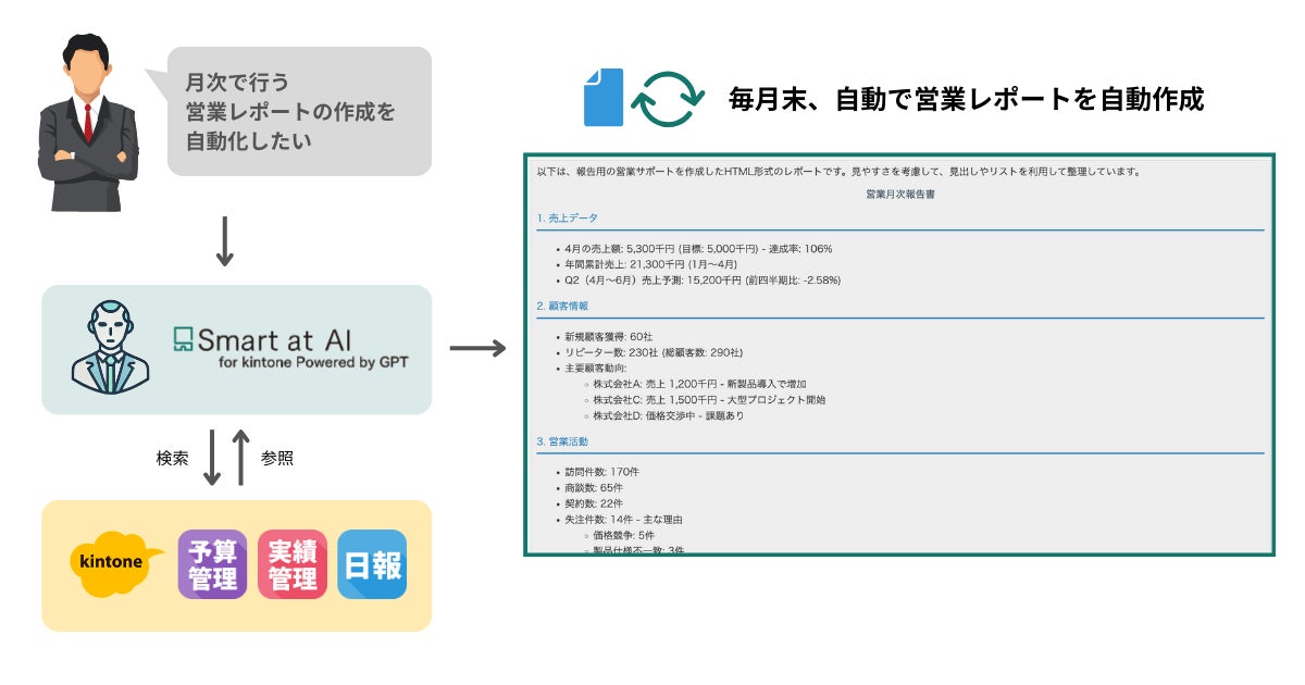 営業レポート作成に関するデータを管理している各kintoneアプリのデータを参照しながら、月次の営業報告レポートを自動的に作成し、作業時間の削減に貢献します。