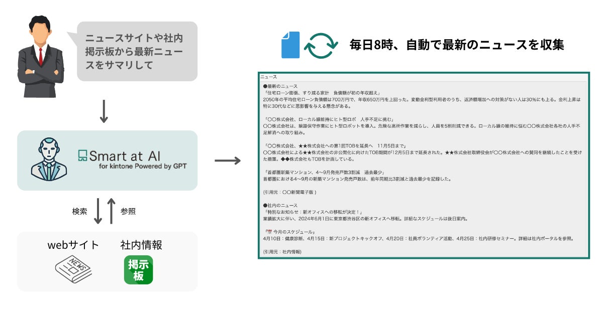 外部のニュースサイトや社内情報を掲載するkintoneアプリからの最新情報を、毎朝自動でサマリ化します。重要な情報を逃さずキャッチし、情報収集の手間を軽減することで、業務効率を向上させます。
