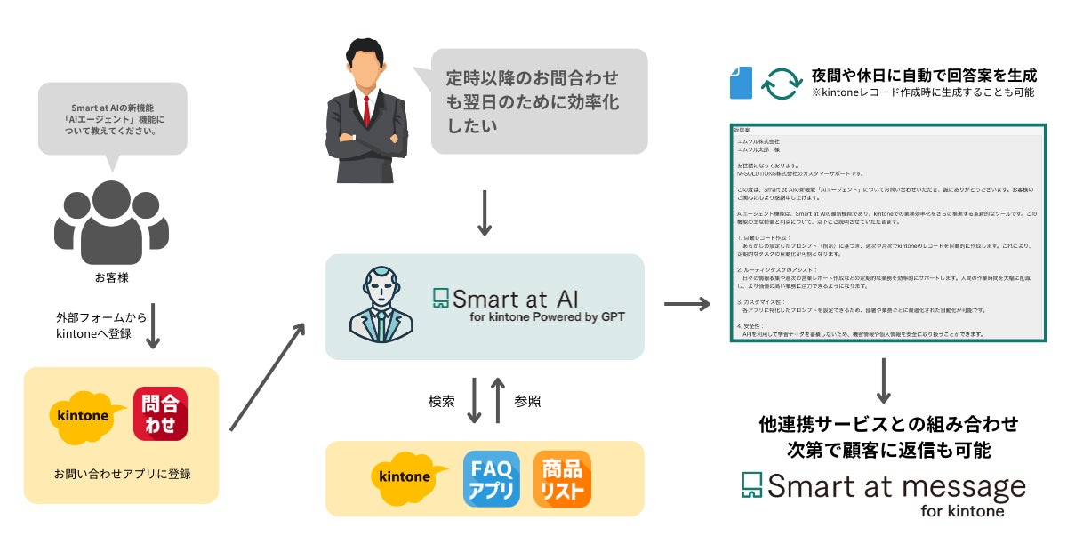 M-SOLUTIONS株式会社(本社:東京都新宿区、代表取締役社長CEO:植草 学、以下 M-SOLUTIONS)は、サイボウズ株式会社の提供する業務改善プラットフォーム「kintone」と生成AIが連携できるkintone連携サービス「Smart at AI for kintone Powered by GPT」(以下:本サービス)に、AIエージェント機能を2024年10月31日(木)より追加いたします。