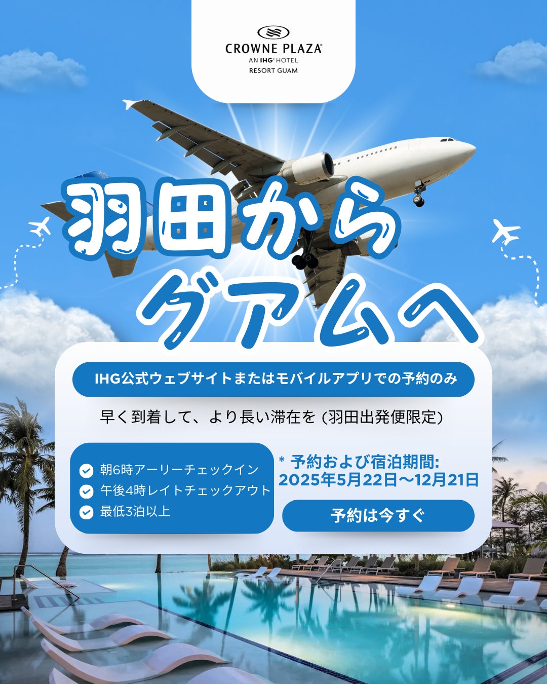 ◾️特典:朝6時のアーリーチェックインと午後4時のレイトチェックアウトが保証され、グアムでの時間をより長く、自由にお楽しみいただけます