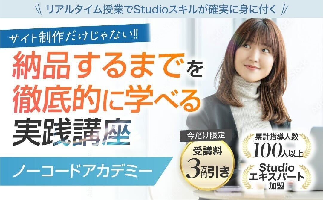ノーコードアカデミーは国内初のリアルタイム授業×納品サポート付きのハイブリット型講座です。Studio制作分野で100名以上の指導経験をもとにStudioエキスパートであるノクステックが設立しました※2025年1月時点 日本国内における「Studio分野でのリアルタイム授業×納品サポート付き講座」として自社調べ