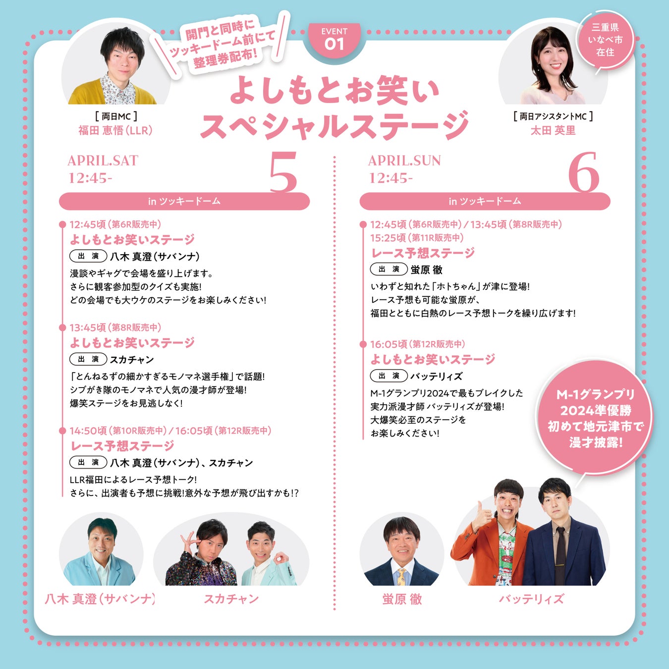 4月5日(土)・6日(日)の2日間にわたり、多彩なお笑いステージを開催。 4月5日(土)は、サバンナ八木が漫談やギャグ、会場を巻き込んだクイズを披露し、 観客を巻き込みながら会場を盛り上げます。続いて、スカチャンがアイドルモノマネ を交えた漫才を披露。後半の2ステージでは、MC福田とともにサバンナ八木、スカチ ャンがレース予想に挑戦し、軽妙なトークを展開します。 4月6日(日)には、蛍原徹が1〜3ステージ、MC福田とともにレース予想を行い、 ユーモアを交えながら会場を盛り上げます。4ステージ目には、M-1グランプリ2024 準優勝の吉本芸人バッテリィズがなんと初めて地元津市で漫才披露!漫才後にはM-1 グランプリの秘話などを話すトークショーを開催!