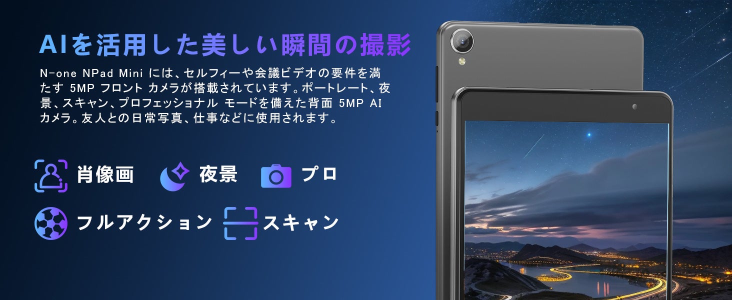 前後に5MPの高画質カメラを搭載し、日常的なビデオ会議、ビデオチャット、人物撮影、夜景撮影に対応します。