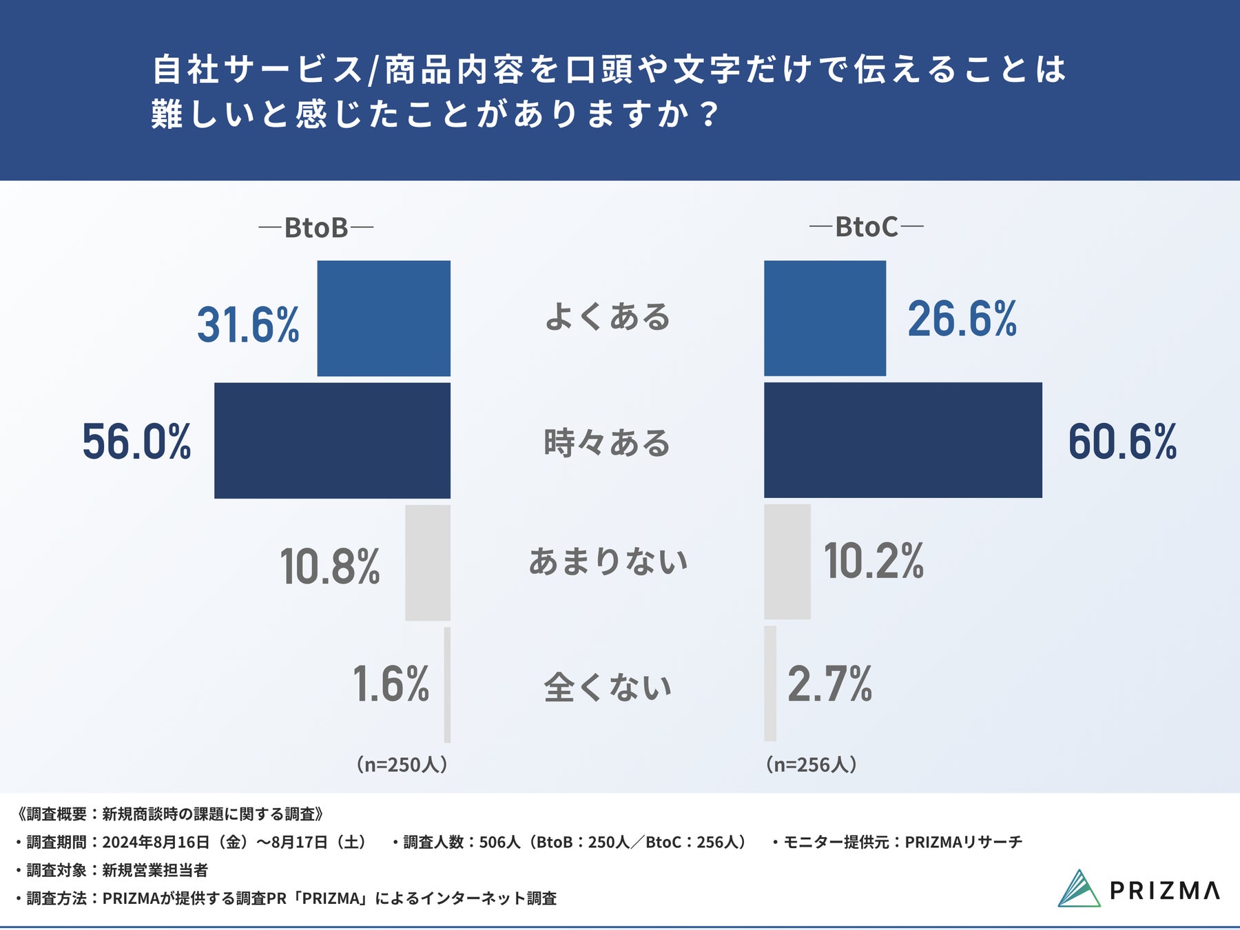 また、BtoB企業・BtoC企業ともに約87%の方が、「自社サービス/商品内容を口頭や文字だけで伝えることは難しいと感じたことがある」と回答していることが分かりました。