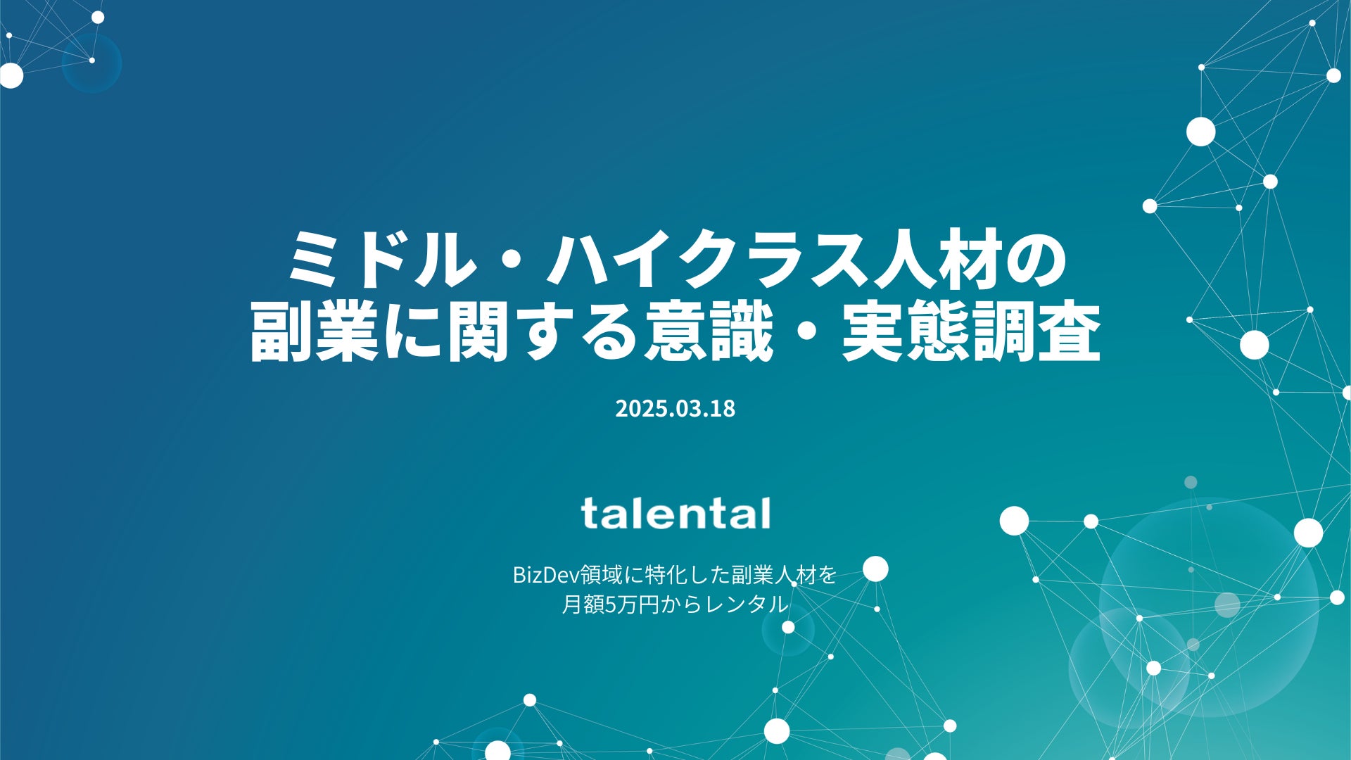 BizDev(事業開発)領域に特化した副業人材のレンタルサービスを手掛けるtalental株式会社(東京都渋谷区、代表取締役社長 武田 直人)は、2025年3月11日~3月15日の期間において、年収600万円以上のミドル・ハイクラス人材を対象に、副業に関する意識や実態について調査を実施しました。