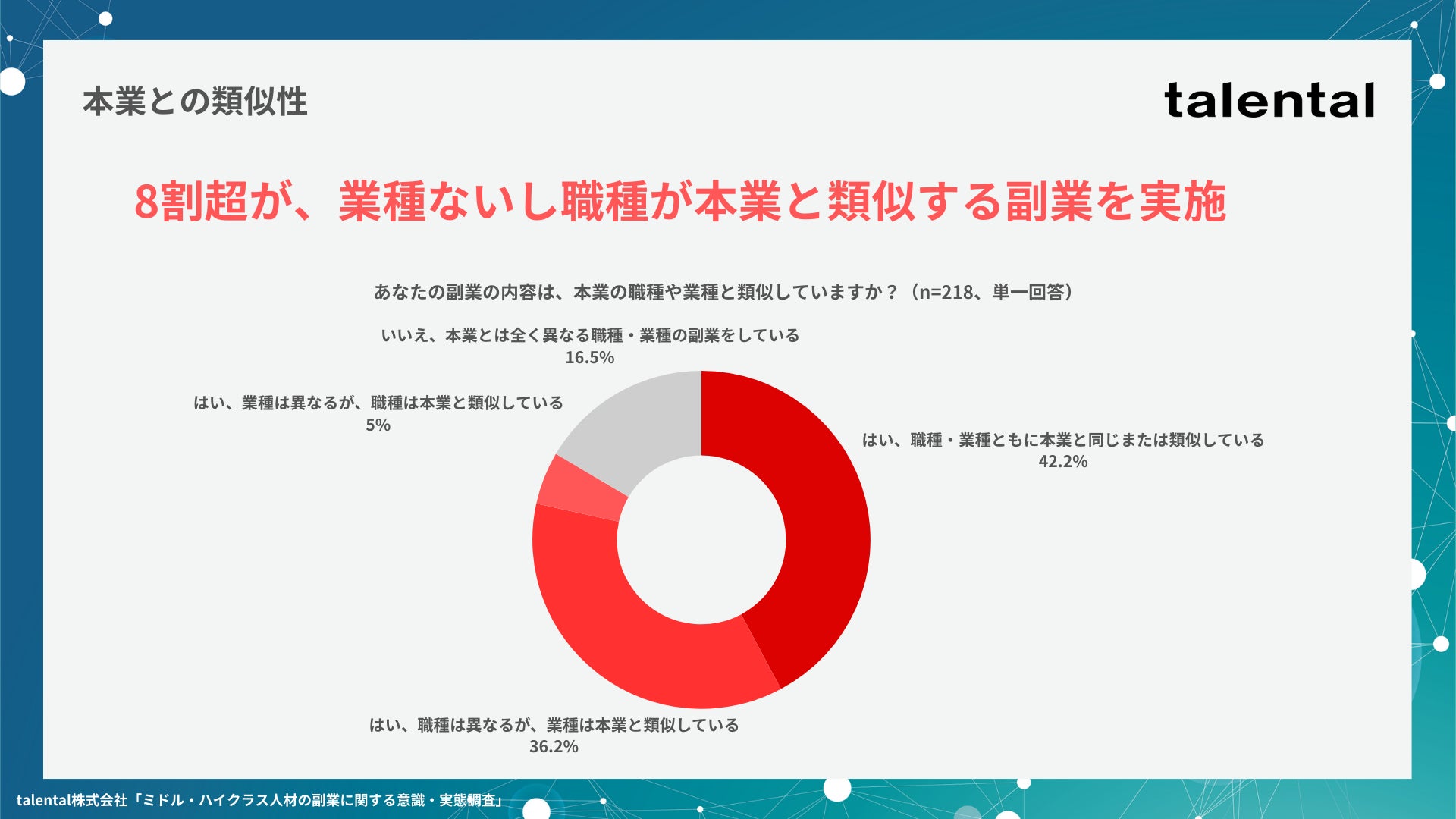 また、本業との類似性について聞いたところ、8割超が本業と業種もしくは職種のいずれが類似しているという結果になりました。