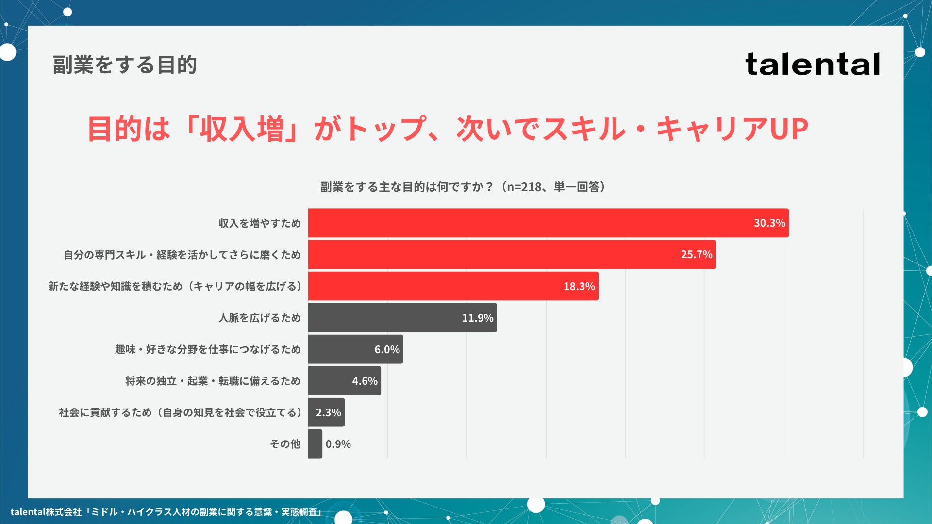 本調査では、スクリーニング調査で抽出した年収600万円以上のビジネスパーソン、かつ直近1年以内に副業を実施していると回答した218名を対象に、副業の目的や実態について調査しました。副業の主たる目的としては、「収入増」がトップという結果となり、次に「スキル・キャリアUP」に該当する回答が2位・3位となっております。
