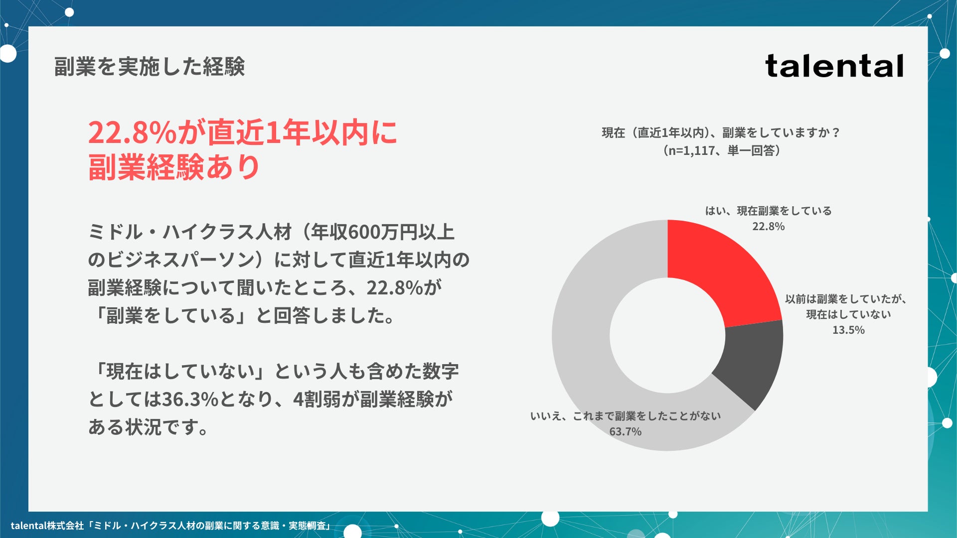 それから7年が経った2025年現在、ビジネスパーソンの副業に対する意識や実態はどのように変化しているのでしょうか。talental株式会社では、年収600万円以上のミドル・ハイクラス人材を対象に、副業に関する意識や実態について調査を実施しました。