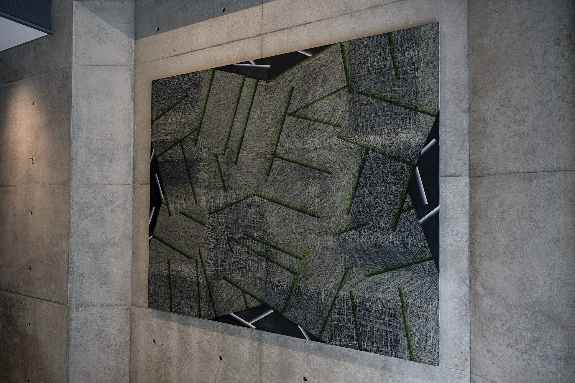 1960 年代には〈⼈体〉を主題とし、⽣命の有機的なかたちと無機的な構造物を対置させ、スプレー技法による圧迫された⾝体像を通じて、存在の緊張と葛藤、動と静の相克を描きました。1975 年の渡⽶を契機に、守⾕のまなざしは次第に絵画の根源的な構成要素である「線」「⾯」「⾊⾯」へと向かい、表現は抽象へと深化していきます。80年代以降、スクラッチ技法で絵具層を削り出し、線の反復や集積によって時間や記憶の痕跡を刻む《作品》や《跡》シリーズを展開。さらに、秩序とわずかなズレが静かなリズムを⽣む《列》、古代の円墳や霊廟の建築的記憶を幾何学的形態に昇華した《廟》シリーズへとその探求は広がりました。守⾕の作品には⼀貫して「物質と⾏為」「記憶と時間」「構築と痕跡」が交錯し、その探究の歩みは、到達することのない理想郷に向かって続く果てなき旅そのものです。