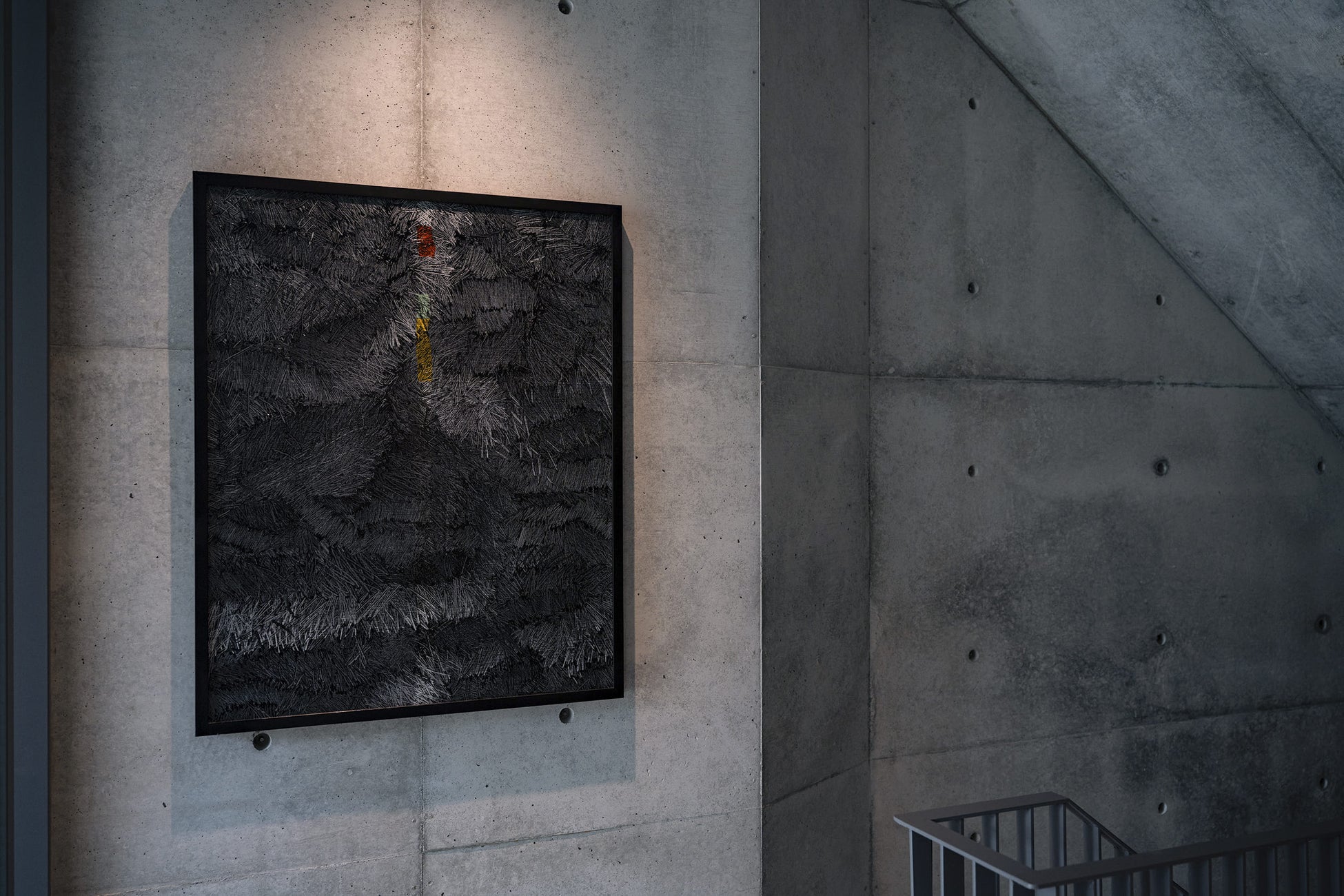 1960年代から70年代初頭にかけては、〈⼈体〉を主題に、有機的な⾝体と無機的構造物を対⽐させた具象表現を探求し、スプレー技法による⼈体像に⽣命⼒と冷たさ、動と静の緊張感を宿しました。1975年、O.I.F.S.海外派遣⽂化交流員として渡⽶した経験を契機に作⾵は⼤きく転換し、絵画の根源的要素である「線」「⾯」「⾊⾯」に着⽬した抽象表現へと移⾏。80年代にはスクラッチ技法による《作品》シリーズや変形パネルを⽤いた《跡》シリーズを展開し、線の反復や集積を通じて時間の痕跡や記憶の層を画⾯に刻みました。90年代以降は棒状や⾻状の形体を秩序⽴てて並置する《列》シリーズ、さらには韓国の円墳や霊廟の建築的構造に着想を得た《廟》シリーズを発表し、幾何学的形態と⺠俗的象徴を融合させて個と集団、過去と現在が交錯する空間を構築しています。