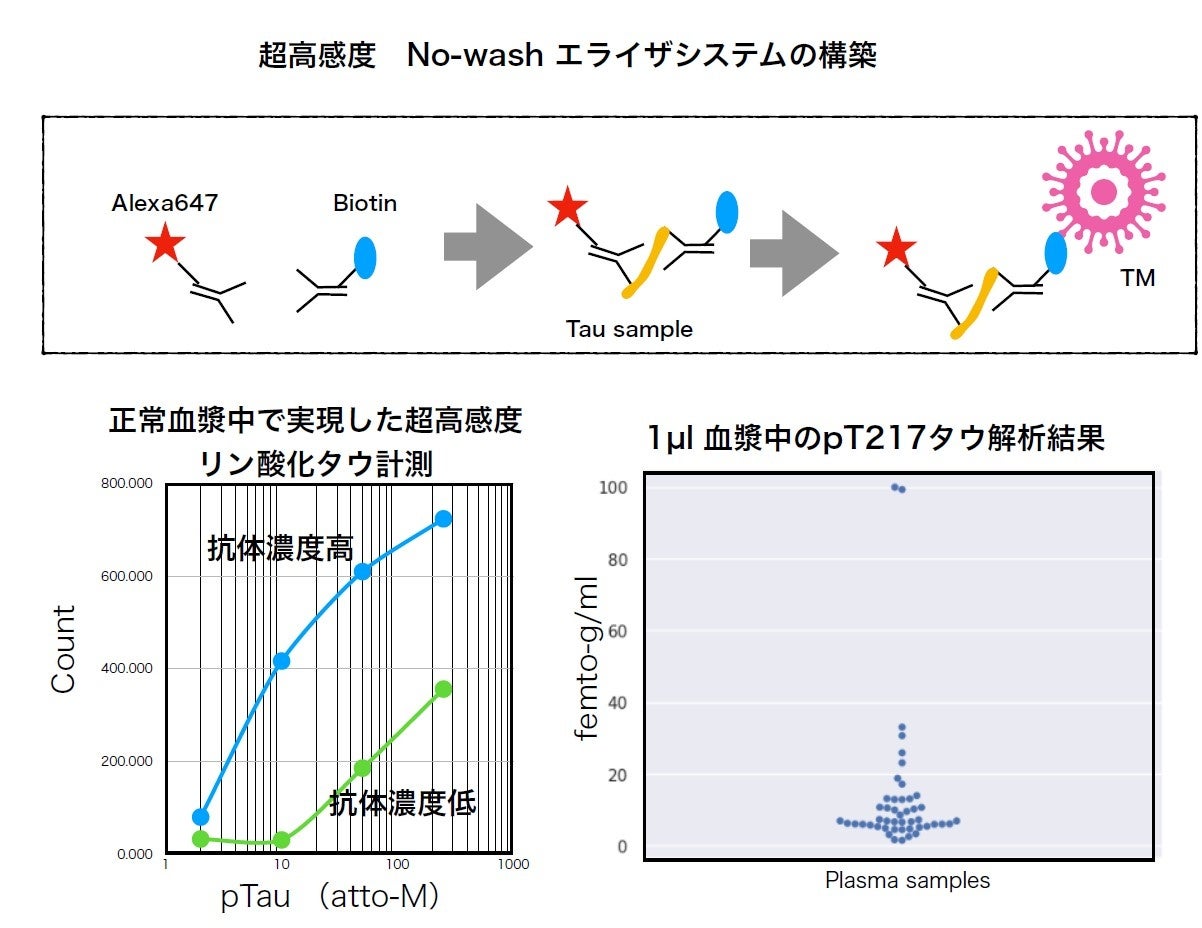 しかしリン酸化タウ217の血中濃度はピコグラム/mlオーダーと超低濃度であり、更にその血液1滴による検査となるとフェムトグラム/mlオーダーの超高感度な検査技術が求められていました。