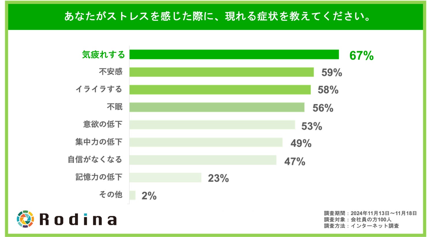 ストレスを感じた際に現れる症状について聞いたところ、「気疲れする(67%)」と回答した方がもっとも多い結果となりました。その他の回答は拮抗し、「不安感(59%)」「イライラする(58%)」「不眠(53%)」「意欲の低下(53%)」などの回答が、半数以上の方が回答しました。