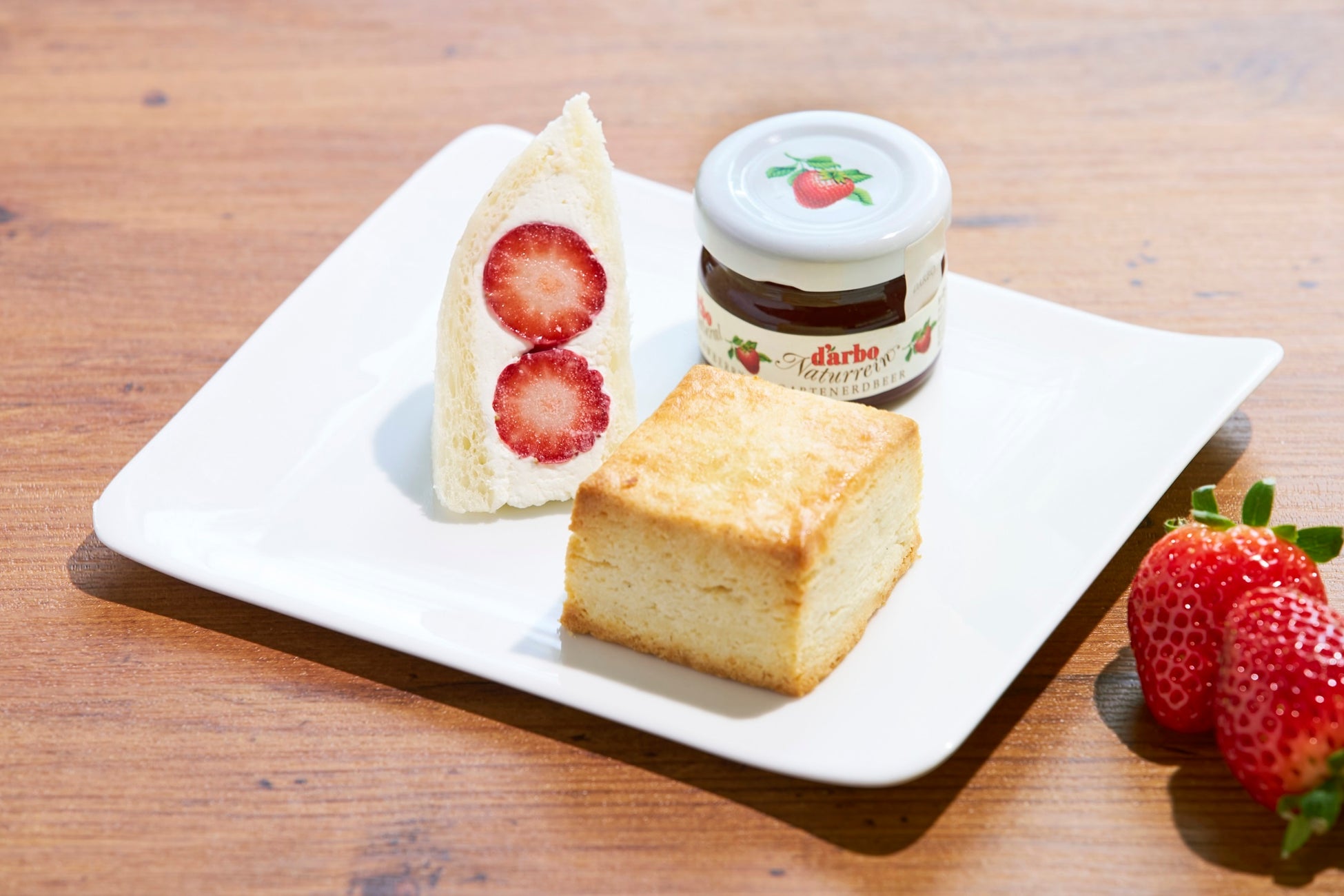 外はさっくり、中はしっとりと焼き上げたスコーンに、自家製イチゴジャムを添えました。苺の濃厚な甘酸っぱさがスコーンの素朴な味わいを引き立てます。また、ふわふわのパンにフレッシュ苺と軽やかな甘さのクリームを挟んだ苺サンドは、苺そのもののフレッシュ感を楽しめる爽やかな仕上がりです。
