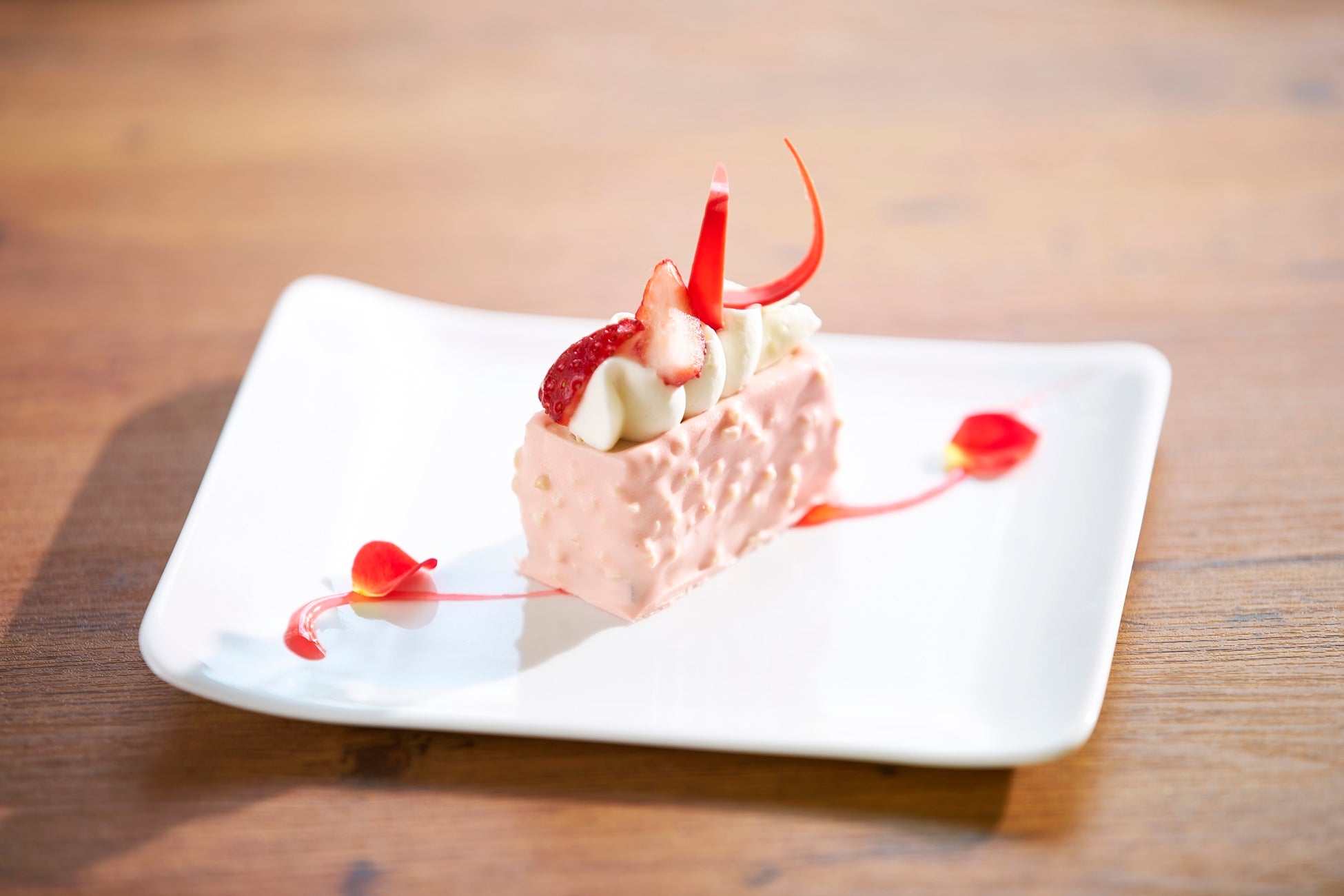苺のホワイトチョコレートでコーティングしたミルクショコラガナッシュと苺ムースは、濃厚なチョコレートスポンジと苺風味のミルクチョコムースが層を成し、リッチな味わいが特徴です。トップにはふんわりとシャンティクリームを添え、鮮やかな苺チョコレートとフレッシュな苺でデコレーションしました。