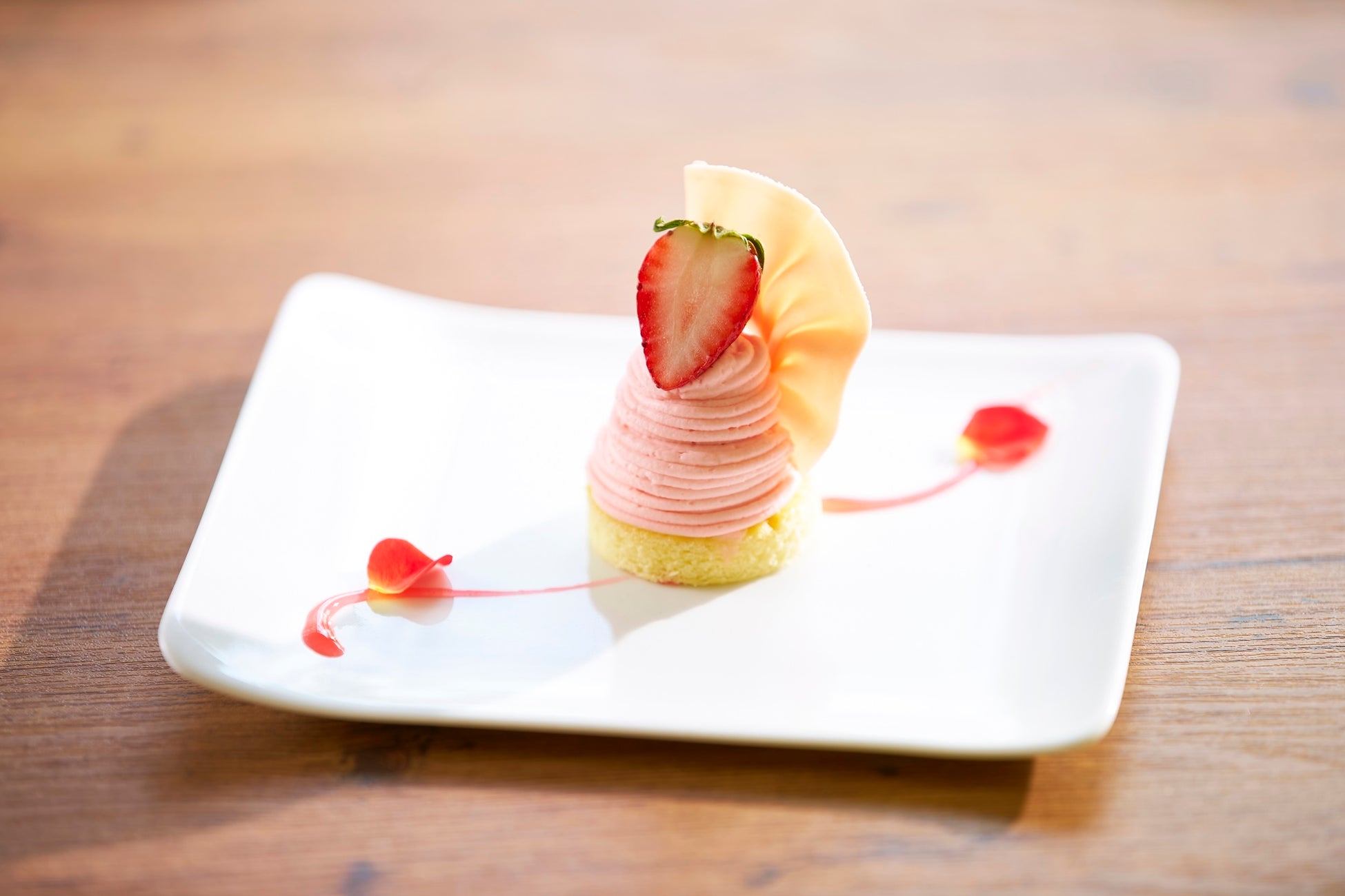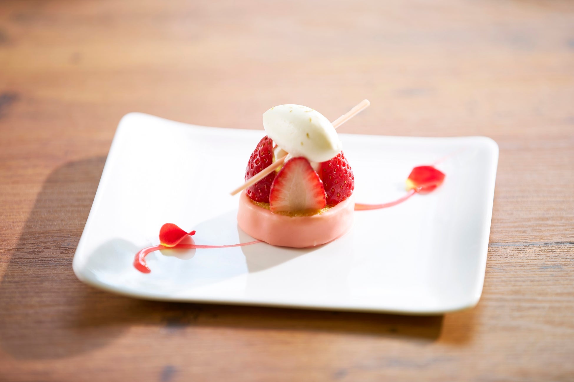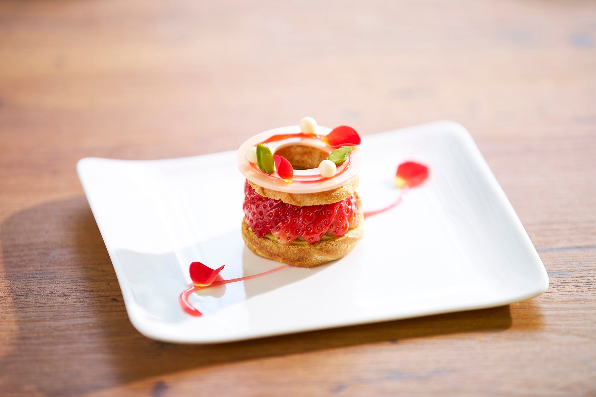 主役となる苺には、芳醇な味わいが特徴の茨城県鉾田市産「村田さん家のいちご(とちおとめ)」をはじめ、鮮やかな色合いで酸味の効いた「紅ほっぺ」、さらに濃厚な甘さが特徴の「とちあいか」の3種類の苺を使用しました。それぞれの苺の個性を生かし、フレッシュ、ピューレ、コンポートなど多彩な手法で仕上げたスイーツが並びます。