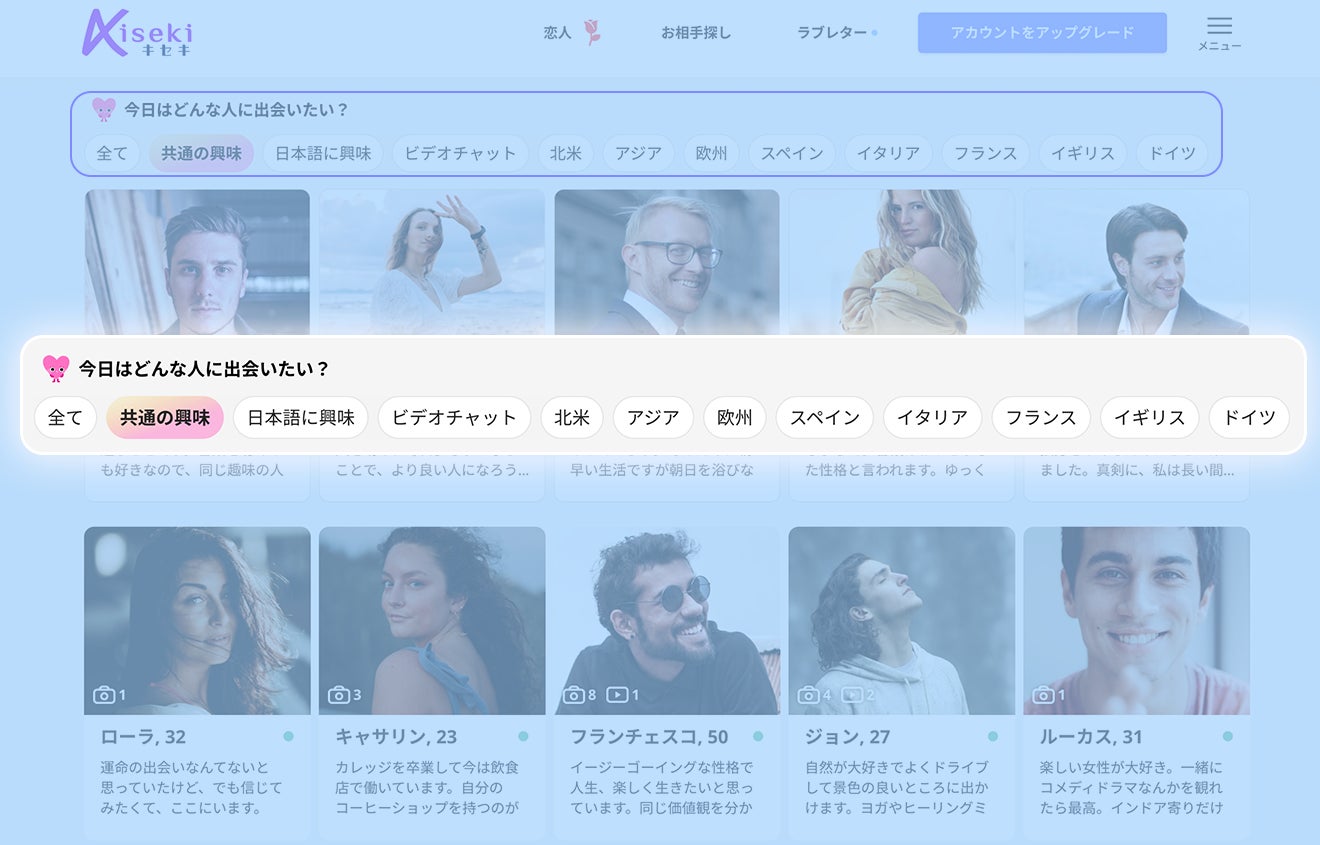 Kisekiとは、オンラインで約80カ国※1のメンバーと出会えるオンライングローバル恋愛マッチングサービスです。日本にいながら北米、ヨーロッパ、アジアなど様々な地域のメンバーとオンラインで繋がり、愛を深めることができます。AI自動翻訳※2が搭載されており、コミュニケーションは日本語でOK、言語の壁はありません。運命の恋を見つける以外にも、オンライン彼氏/彼女を見つけたり、海外の友達を作るなど用途にあわせたご利用が可能です。