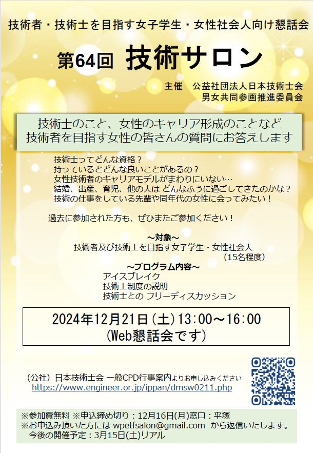 参加資格は、技術者及び技術士を目指す女子学生・女性社会人で、参加費は無料となっています。キャリアパスに不安を抱える女子学生や女性技術者の皆さま、ぜひ、ご参加ください。申込みは以下のURLから。15名程度まで。