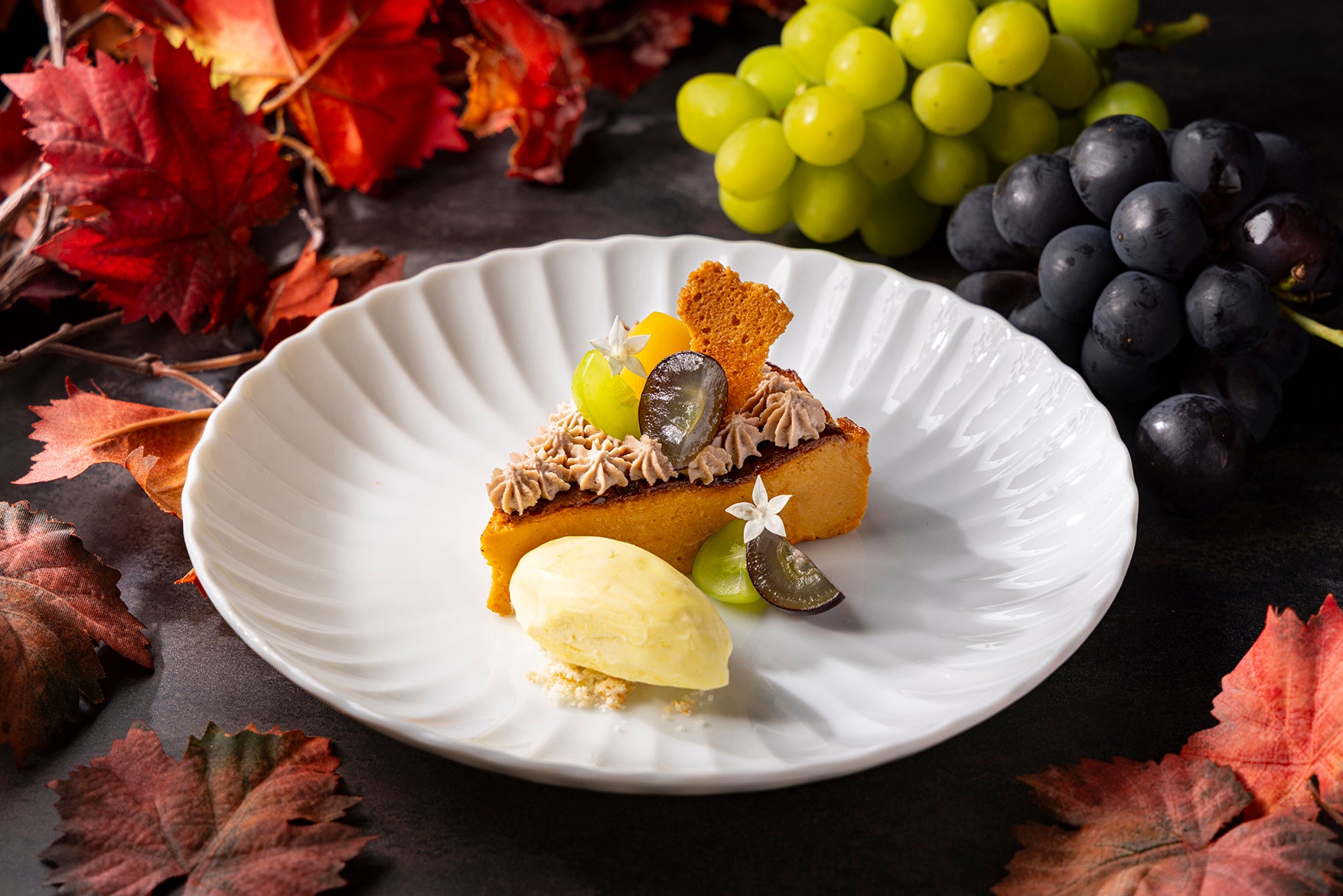 ケーキの上には、香り高い栗のモンブランクリームを贅沢に絞り、旬のぶどうやカリッと焼き上げたナッツのチュイールを飾って秋の豊かさを表現しました。添えられたさつまいもアイスは、素材の甘みを活かした優しい味わいで、ケーキと絶妙なハーモニーを奏でます。