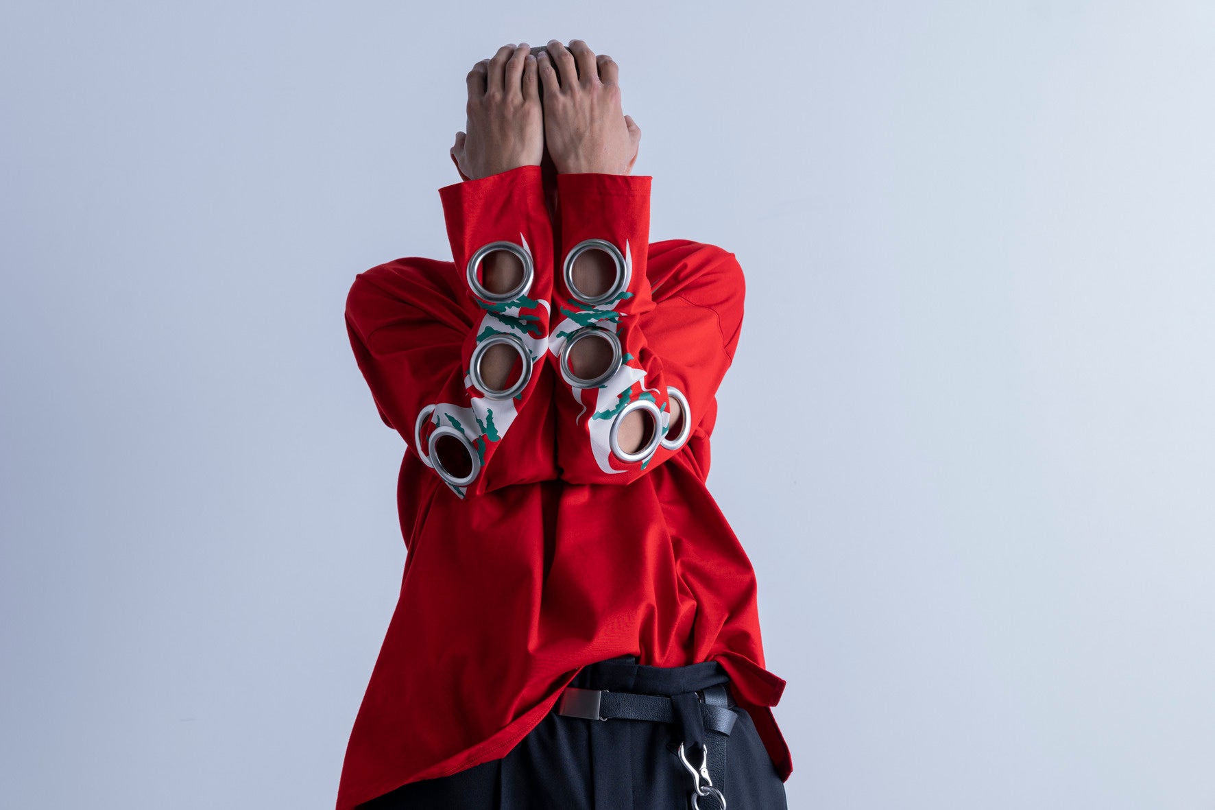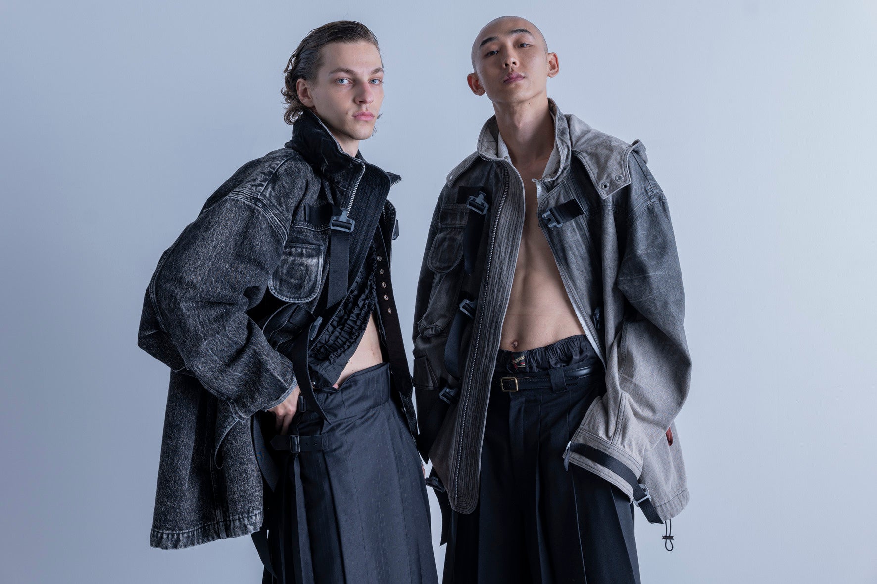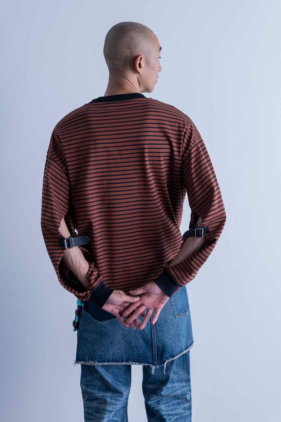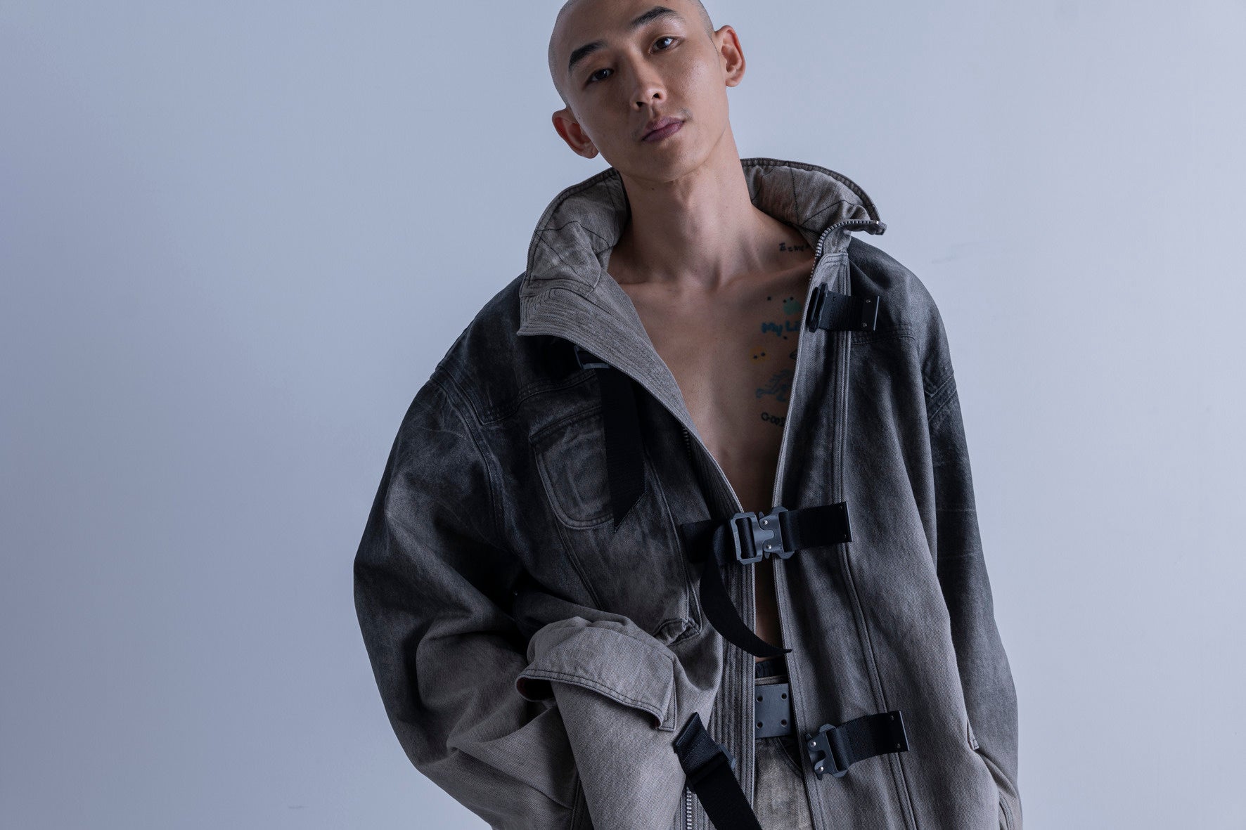 拘束衣から着想を得た大胆なシルエット。コットンリネンの上質な表情とネル裏地が生む心地よさ。潰し加工の金具とベルトデザインが放つ独創的な存在感。着丈とサイズ感で魅せる新しい解釈。