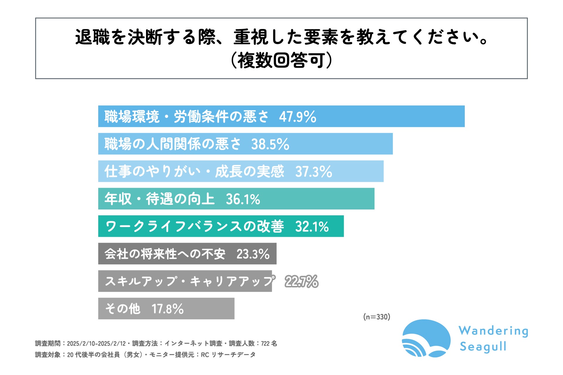退職を決断する際、重視した要素のトップ3は、1位「職場環境・労働条件の悪さ」、2位「職場の人間関係の悪さ」、3位「仕事のやりがい・成長の実感」