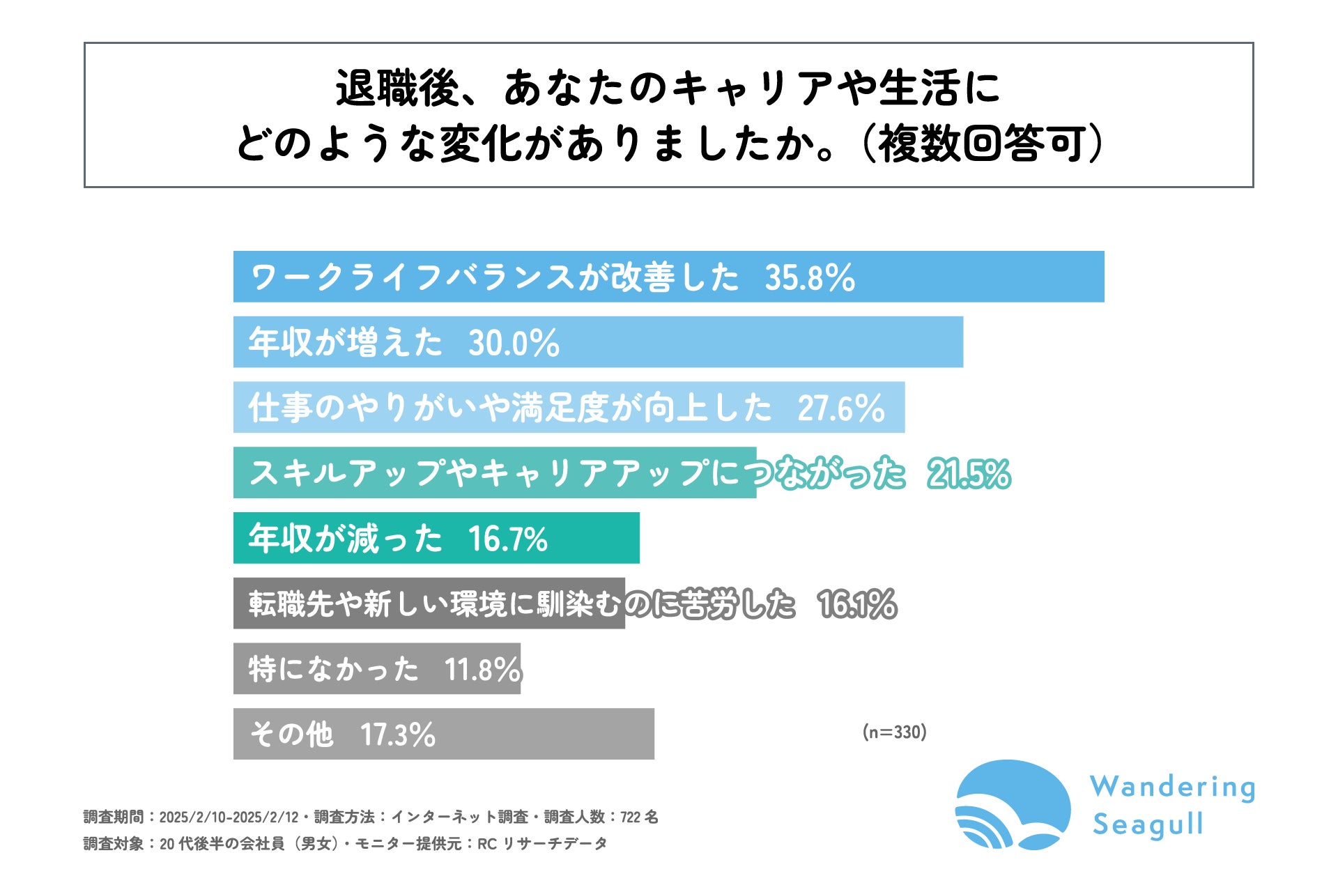 調査の最後、「退職後、キャリアや生活にどのような変化があったか」を尋ねる設問の回答で多かったのは、1位が「ワークライフバランスが改善した」で35.8%、2位が「年収が増えた」で30.0%、3位が「仕事のやりがいや満足度が向上した」で27.6%という結果になりました。ここではポジティブな変化があったという回答が上位に並ぶ形となりました。