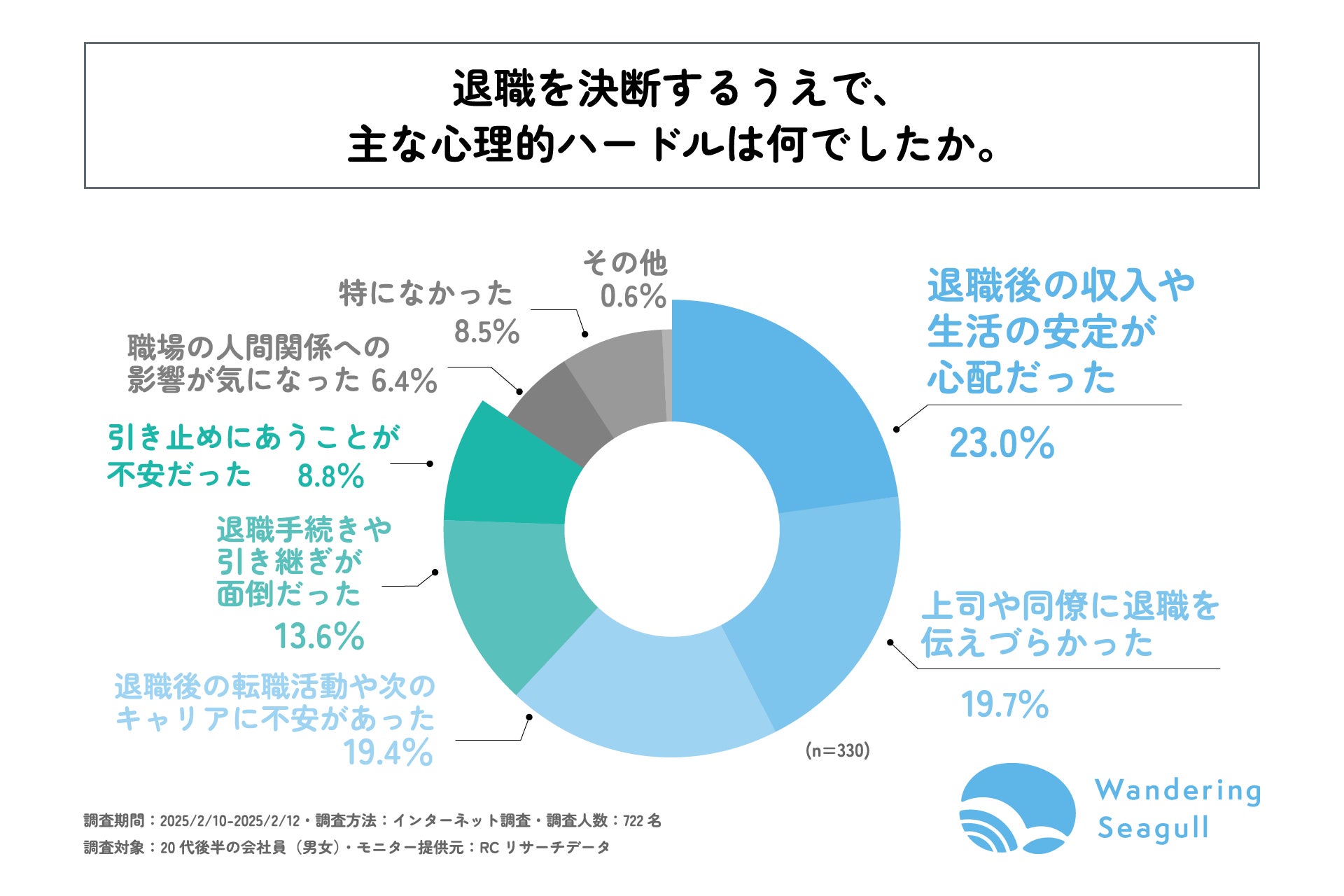退職を決断するうえで、多くの人の心理的ハードルになったものは「退職後の収入・生活の安定への心配」と「上司や同僚への退職の伝えづらさ」
