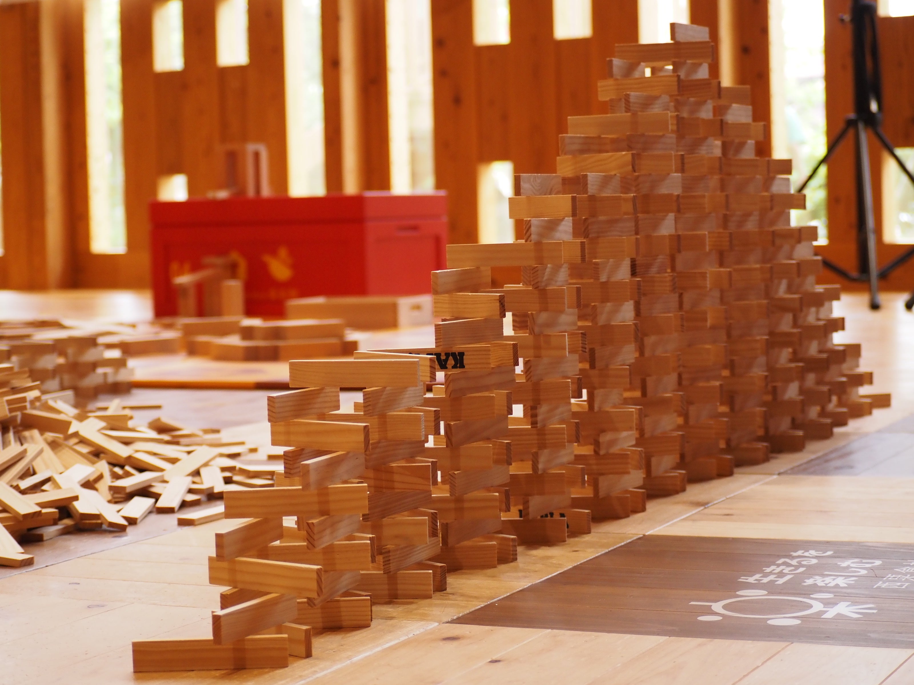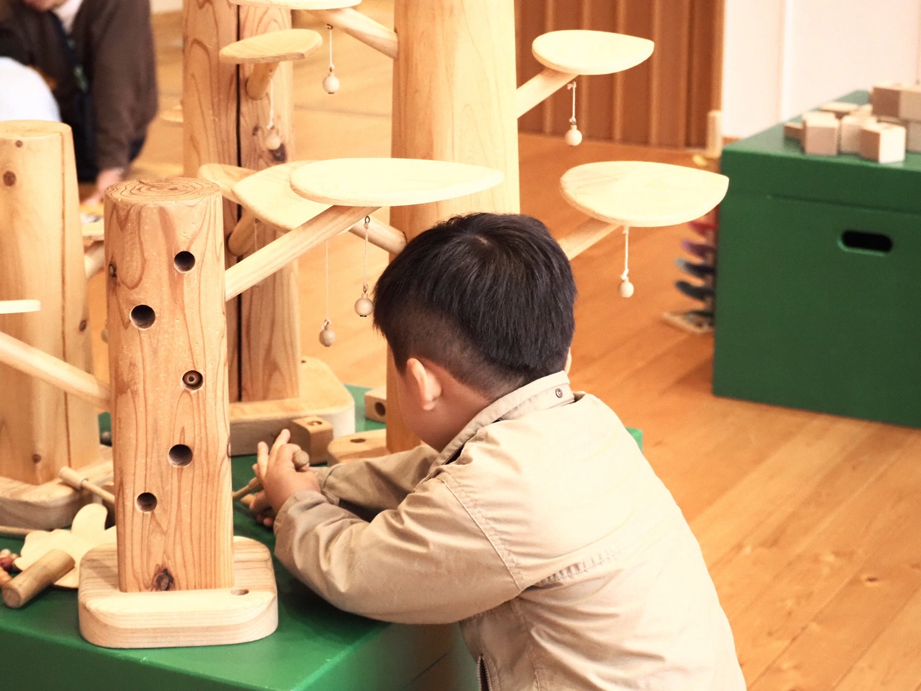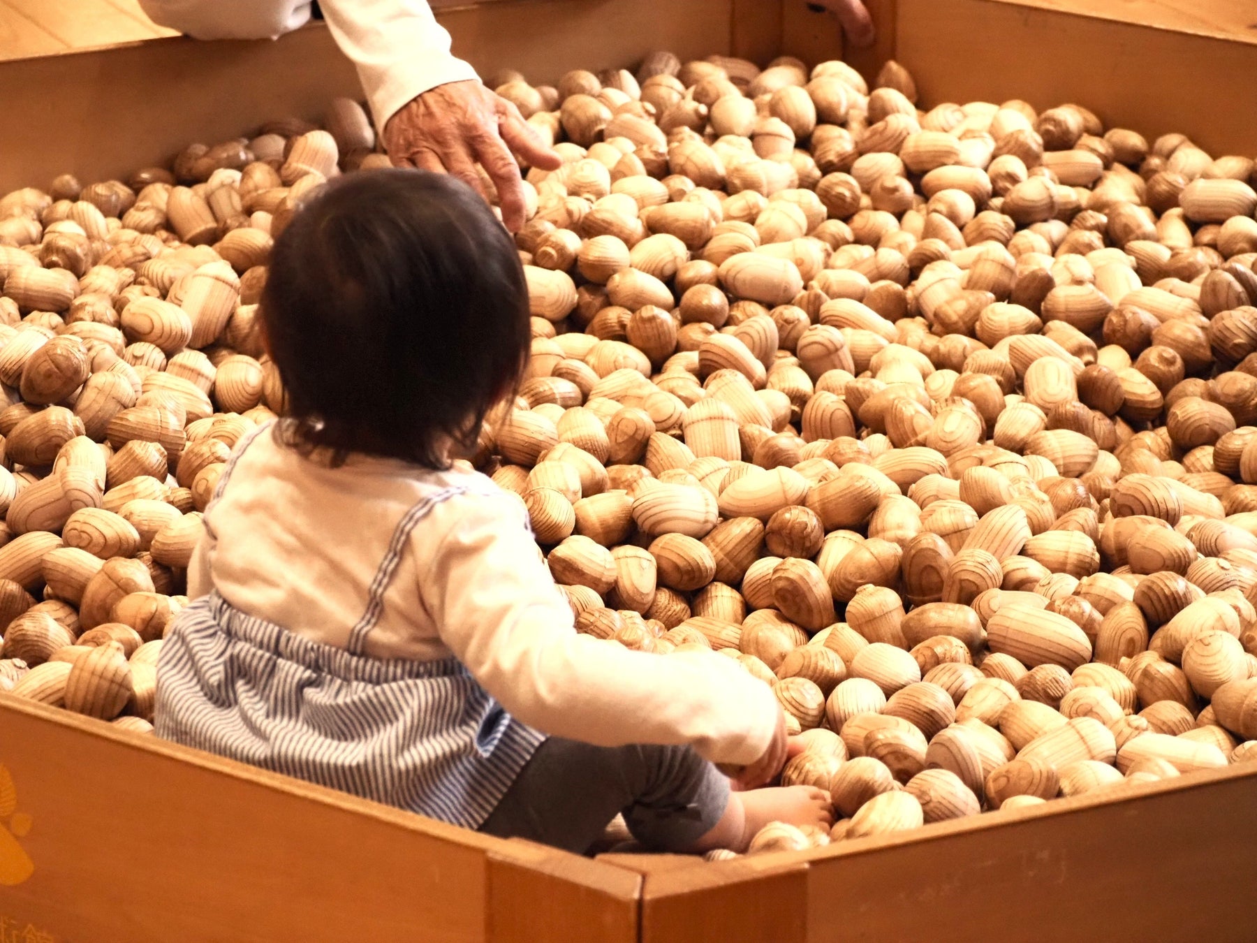ドングリの形をした木のおもちゃを敷き詰めたプールや積み木など、大きな物から小さな物までたくさんの木のおもちゃをあわくら会館の百森ひろばにご用意いたしました。木の香や優しい手触りを感じながら、満足するまで自由に遊んでいただけます。