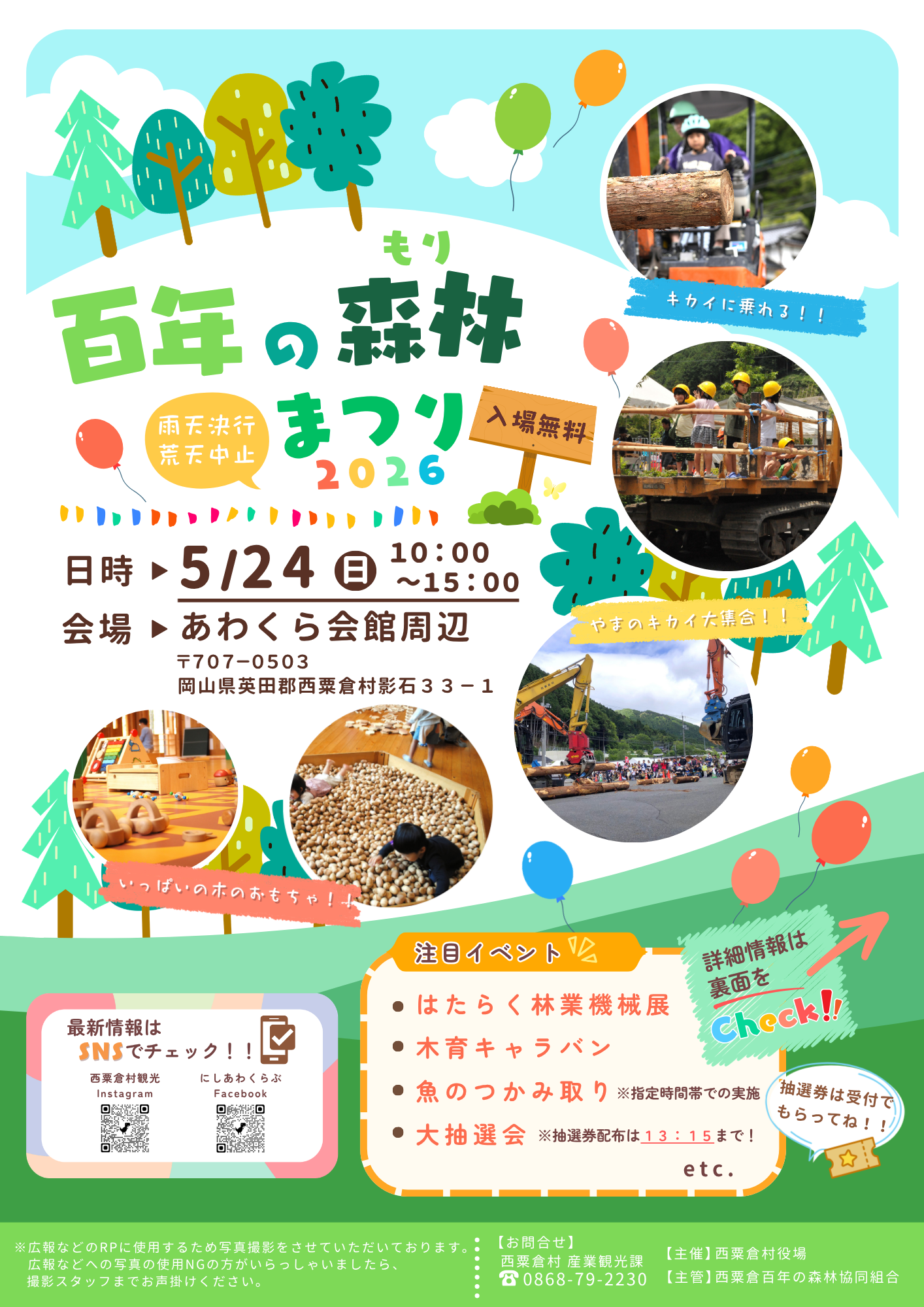 西粟倉百年の森林協同組合(岡山県英田郡西粟倉村)は、西粟倉村が主催する「百年の森林まつり・2026」を5月24日(日)10:00~15:00に開催いたします。林業で使用する林業機械の乗車体験・操縦体験ができる『はたらく林業機械展』コーナー、たくさんの木のおもちゃで自由に遊べる『木育キャラバン』コーナーをはじめ、魚のつかみ取りや西粟倉村産の様々な商品が当たる大抽選会、地元の人々が参加するイベントステージや各種飲食店舗・ワークショップなど、内容が盛り沢山。家族連れでお楽しみいただけるイベントとなっております。
