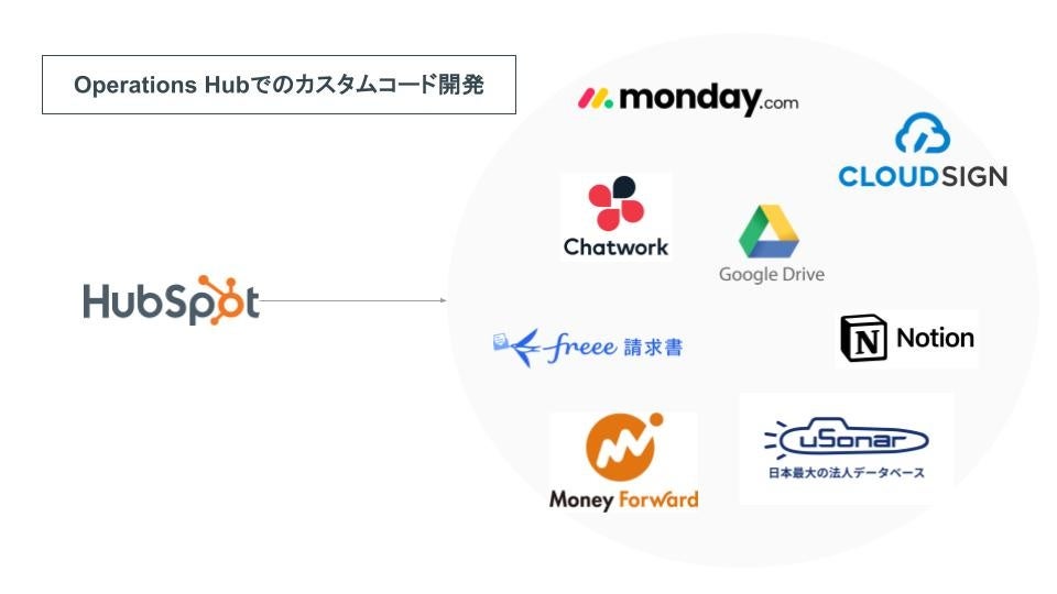 HubSpot内の処理やだけではなく、外部サービスとのAPI連携を開発する際にもご利用いただくことが可能です。※大規模開発の場合は、HubSpot外でAPI開発をいただく形を推奨しております。