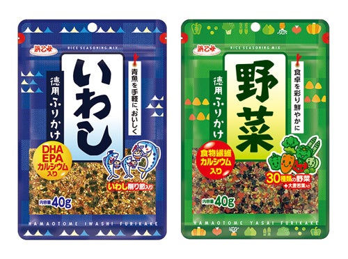 1993年に発売された浜乙女「徳用ふりかけ」シリーズは、こどもが食べにくい魚や野菜を食べやすい味わいに仕上げた家族全員で楽しめるロングセラーのふりかけです。シリーズで一番人気の高い、お魚のふりかけ「いわし」とは一味違う、青魚のふりかけ「焼さば」風味が新たに誕生しました。