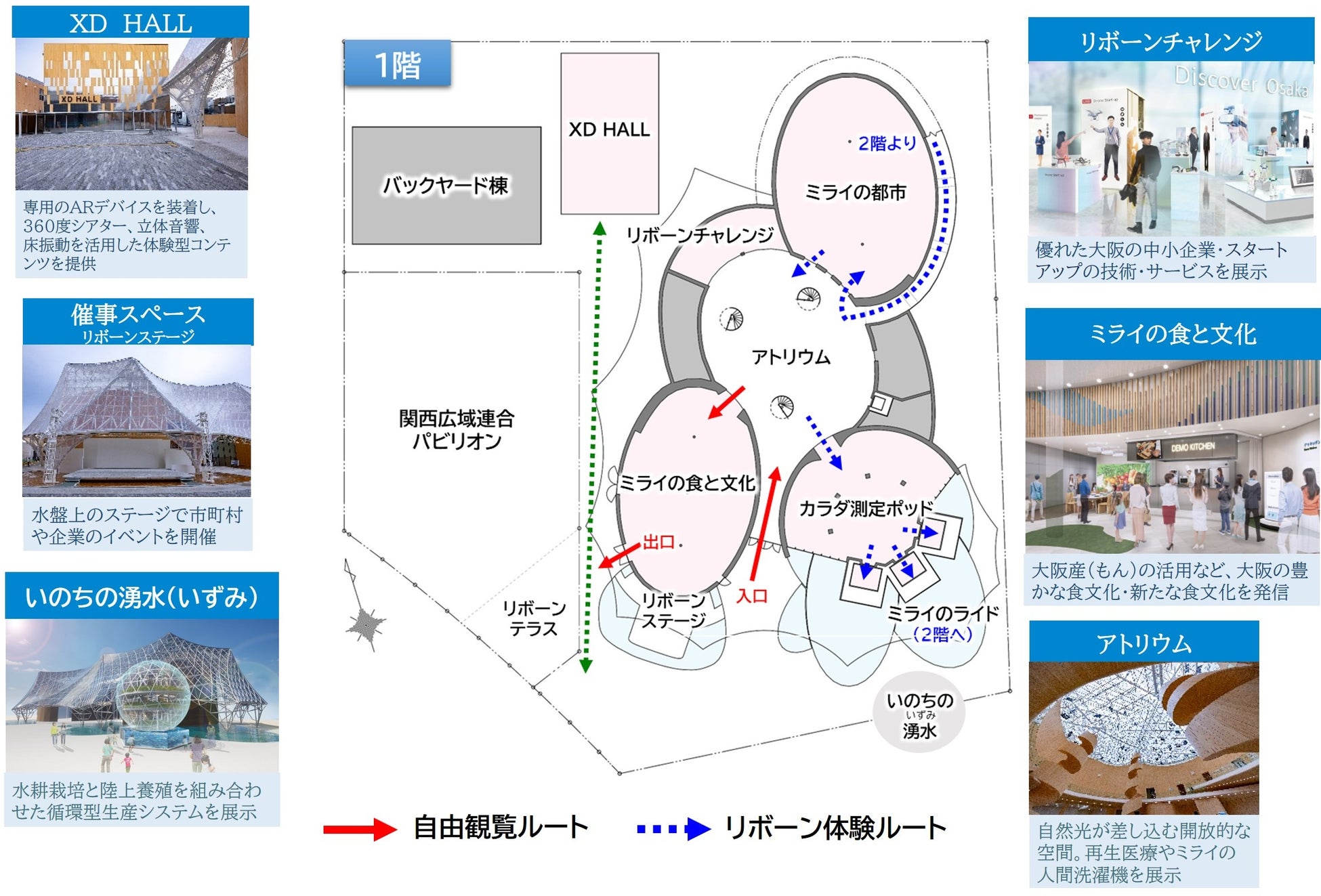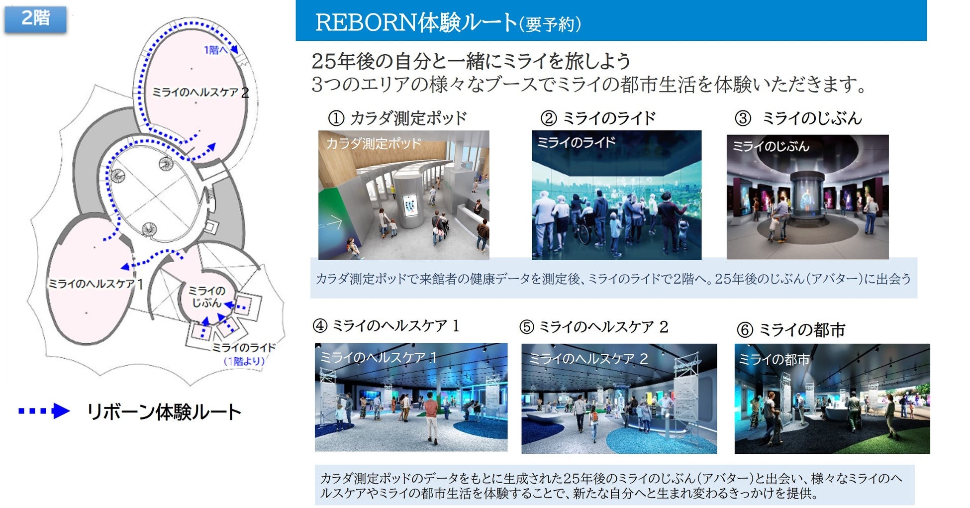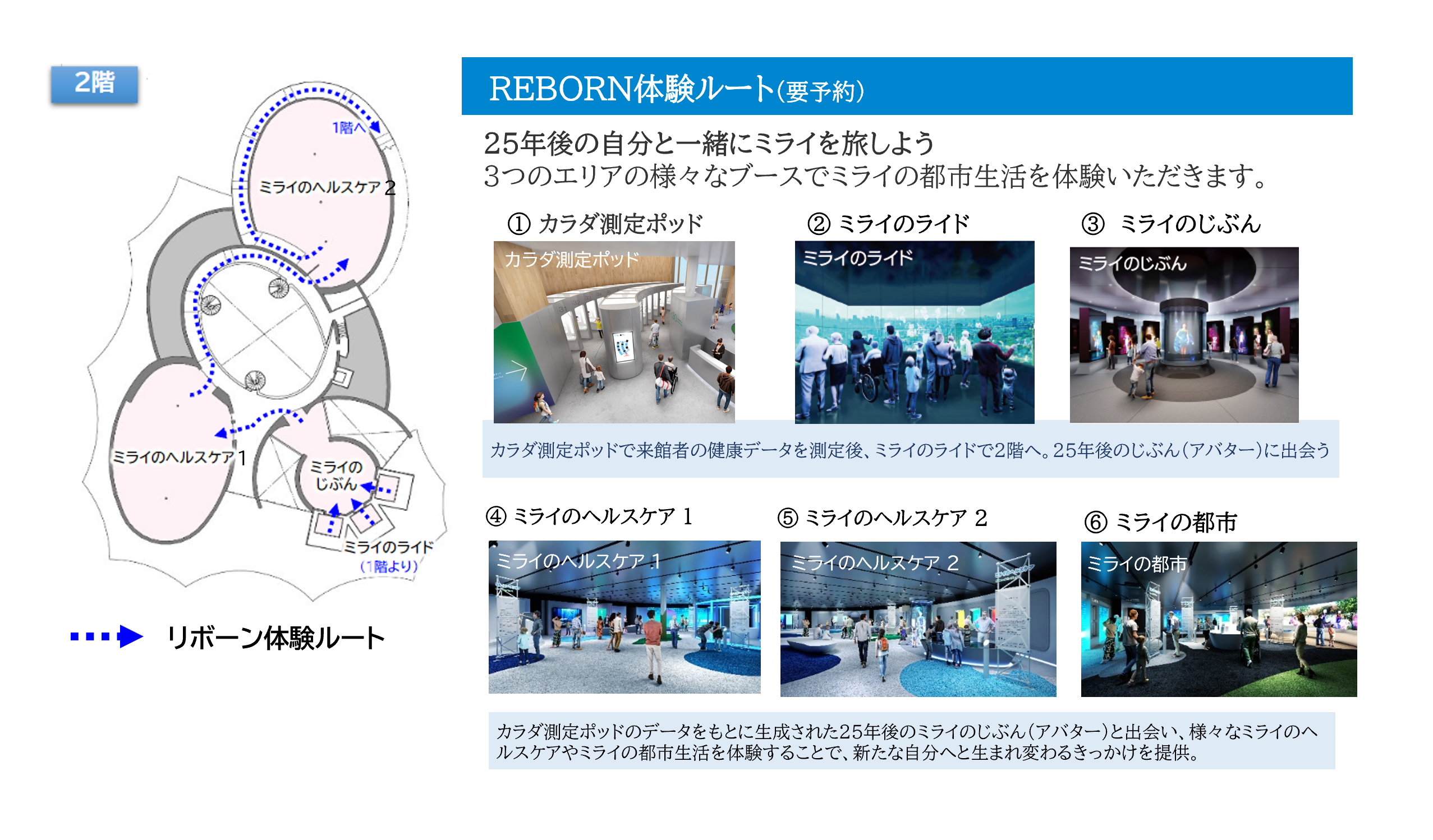 主な展示体験の一つである「リボーン体験ルート」では、「カラダ測定ポッド」を使って、「目」や「髪」、「心血管」など、7つの項目を測定します。そのデータをもとに生成した25年後の姿のアバターに出会い、その後、ミライのヘルスケアや都市生活を体験できるブースをめぐることで、新たな自分へと生まれ変わるきっかけを提供します。その他にも、中小企業やスタートアップの技術力や魅力発信を行う「リボーンチャレンジ」、大阪の食文化を発信する「ミライの食と文化」ゾーン、ミライのエンターテインメントが体験できる「XD HALL」など、来館者の皆さまがワクワクするような展示を行います。