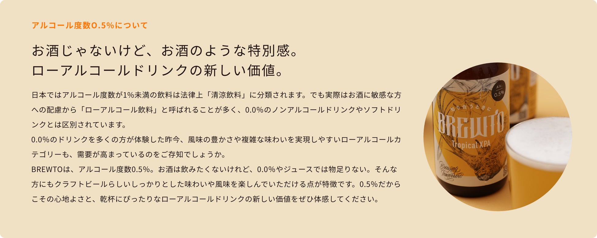 わたしたちは、ローアルコールクラフトビールの新しい可能性を追求し、『飲みニケーション』の楽しさを再発見していただくきっかけになることを願っています。ローアルコールビールをただの飲み物にとどめるのではなく、『笑顔で乾杯し、新しい繋がりを築くきっかけにする一杯にしていただきたい。』というコンセプトをもとに、第一弾としてアルコール度数0.5%のローアルコールビールBREWTO Tropical XPAを開発いたしました。ボトルに書かれた『知り合うときに』というメッセージには、『手に取っていただいた瞬間から新たな出会いを意識してほしい。』という思いが込められています。また、モルトカスの再利用を通じて、わたしたちにできる持続可能な未来に向けたアクションも継続して参ります。仲間とはもちろん、おひとり様でも、あらゆるシーンにフィットする新しいローアルコールクラフトビールBREWTO Tropical XPAをお楽しみください。