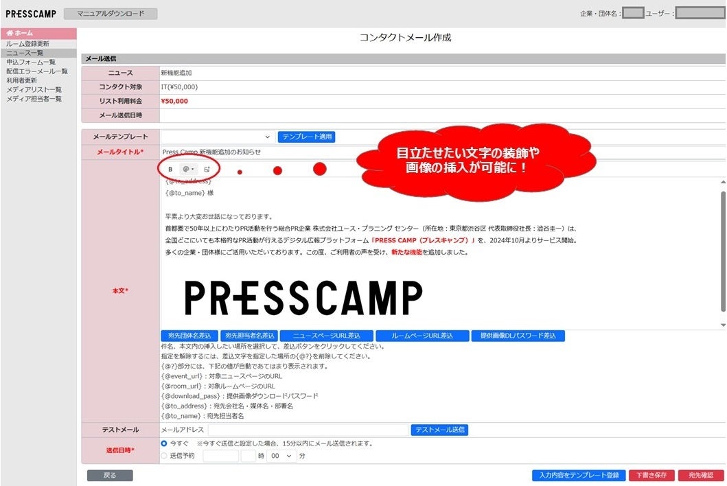 これにより、メール画面をよりインパクトあるデザインにすることが可能に。画像挿入機能により、企業ロゴ、タイトルロゴなどのレイアウト、キービジュアルの挿入も可能となり、ひとめ見ただけでメディアの興味を高めるようなメールづくりが実現します。