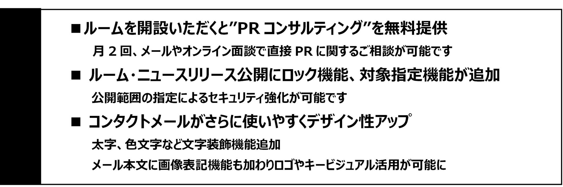 特に、「無料PRコンサルティング」は、ご利用者様やご利用を検討いただいている方から、「ニュースリリースを配信するタイミングが分からない」、「どのメディアに送れば良いのかアドバイスしてほしい」、「費用を抑えるために自分で行いたいが、相談相手がいなくてなかなか実際には踏み出せない」、「ワイヤーサービスを使ってみたが物足りない、なにが物足りない要因なのだろう」などの声をいただき導入。それぞれの状況に合わせた具体的なサポートを行えるマンツーマン・サービスとして提供します。