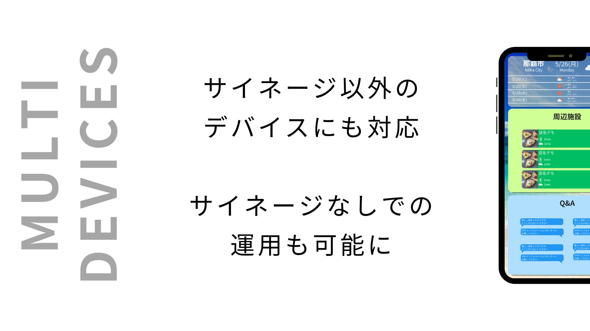 マルチデバイス対応: 大型サイネージだけでなく、タブレットやお客様のスマートフォンなど、様々なデバイスで情報を表示・閲覧可能です。