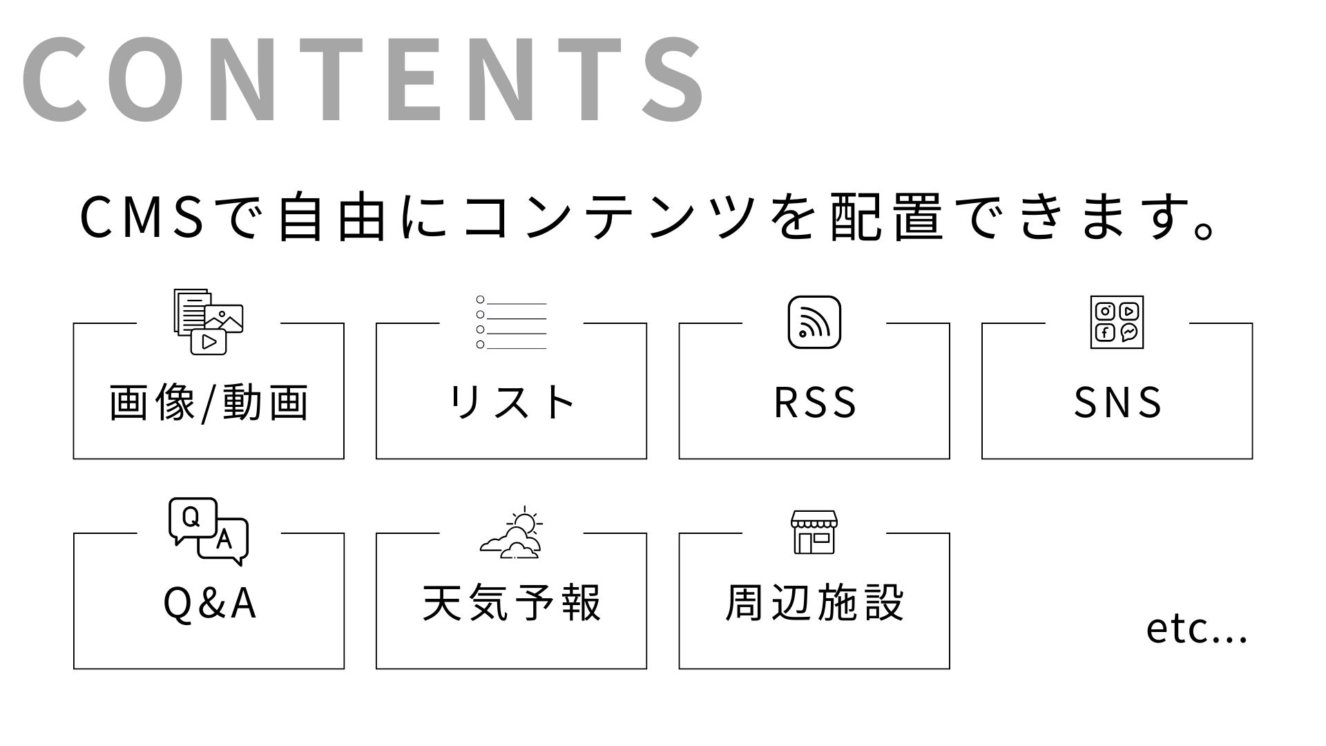 専門知識不要の簡単コンテンツ管理: 直感的に操作できるCMS(コンテンツマネジメントシステム)をご用意。天気情報、動画、画像リスト、RSSフィード、SNS連携、Q&Aなど、多彩なコンテンツを専門知識なしで簡単に作成・更新できます。