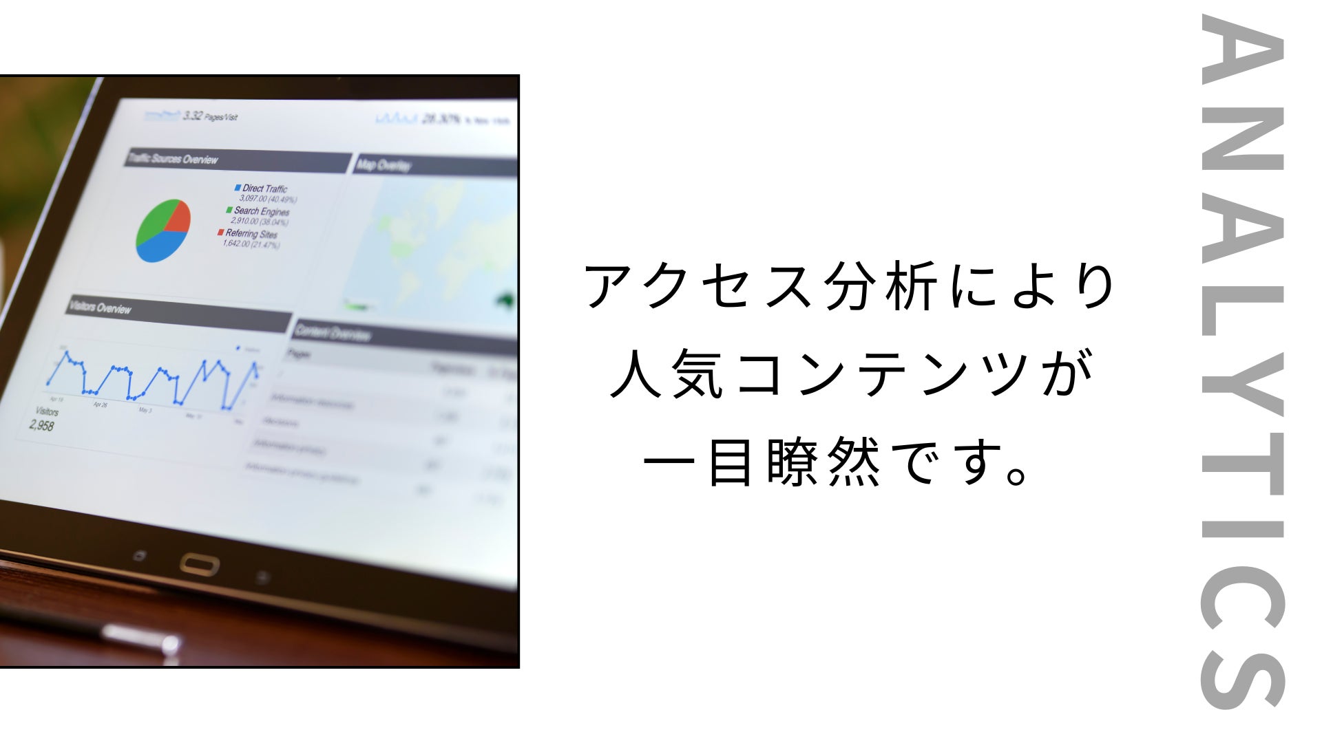 効果測定可能なアクセス解析: どのコンテンツが多く見られているかなどの人気度を分析可能。より効果的な情報発信に繋げられます。