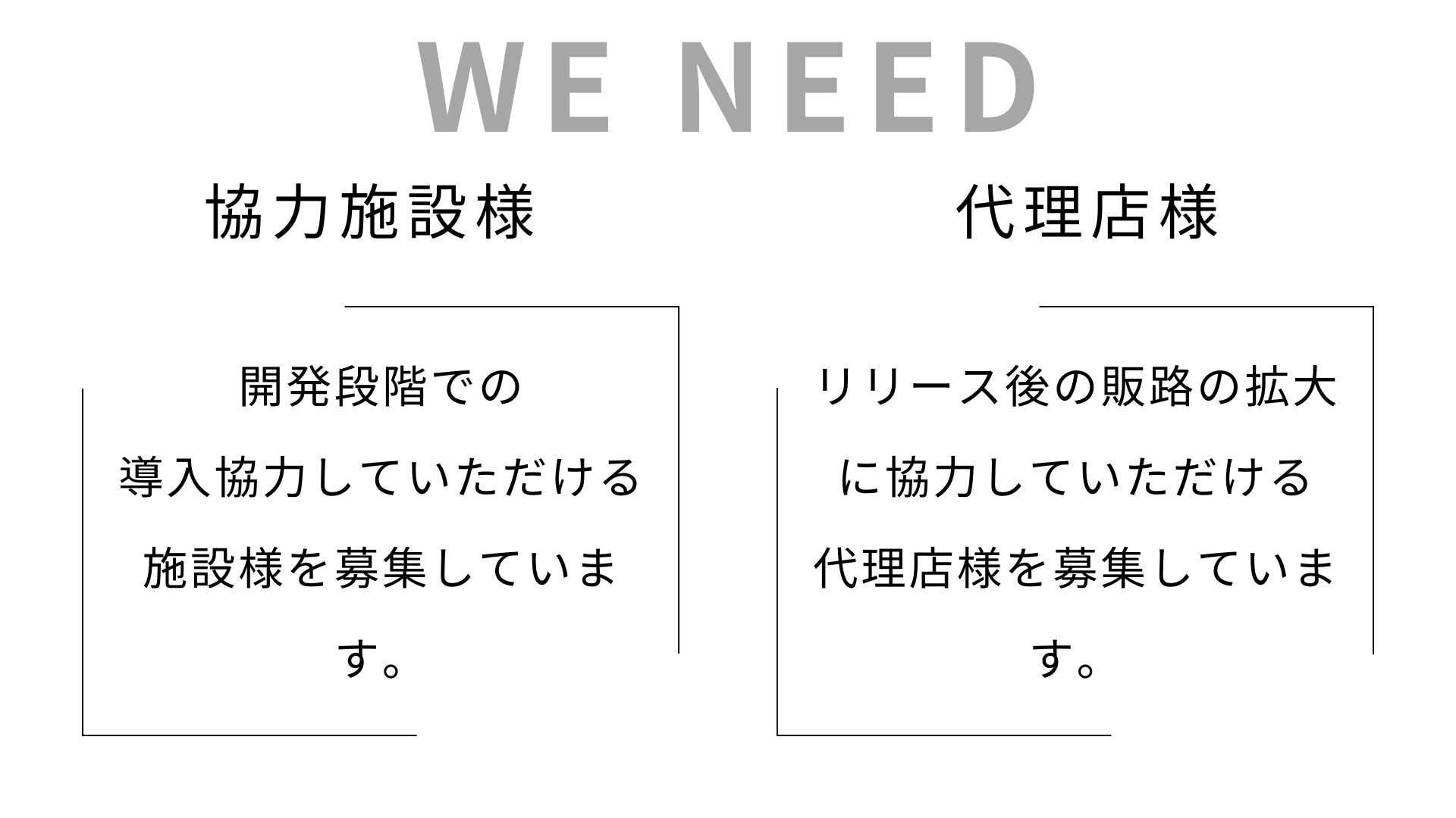 現在、導入実験にご協力いただける施設様、ならびにリリース後の販路拡大にご協力いただける代理店様を募集しております。