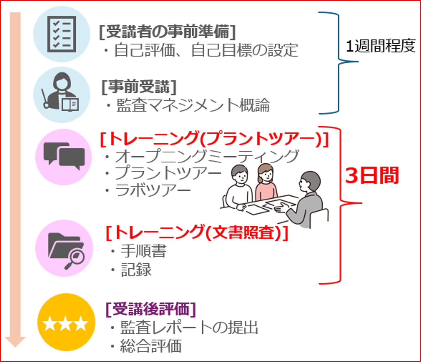 事前の自習と3日間の講習を受ければ監査員へのスキルが身につけられます。