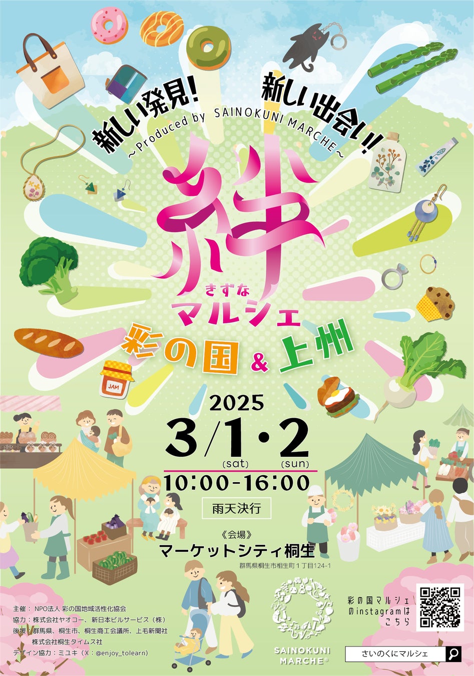 NPO法人 彩の国地域活性化協会(拠点:埼玉県さいたま市、代表理事:佐々木 輝伸)が主催する「彩の国マルシェ」は、2025年3月1日と2日の2日間、群馬県桐生市にあるマーケットシティ桐生にて「絆マルシェ~彩の国&上州~Produced by SAINOKUNI MARCHE~」を開催いたします。