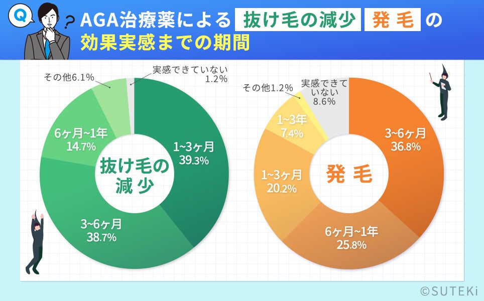 更に、AGA治療薬の効果があったと回答した方を対象に「抜け毛の減少」および「発毛」の効果を実感するまでにかかった期間について調査・分析すると、抜け毛の減少はおおよそ3ヶ月、発毛は早くて3~6ヶ月・遅くて6ヶ月~1年ほどAGA治療を続けることで効果が得られやすいと考えられます。
