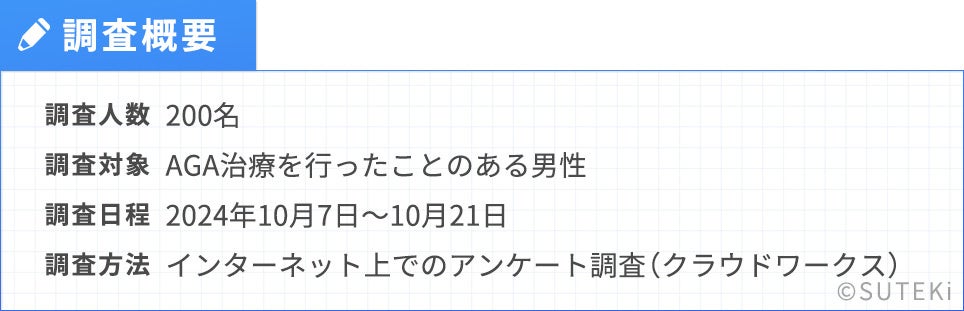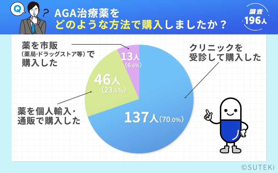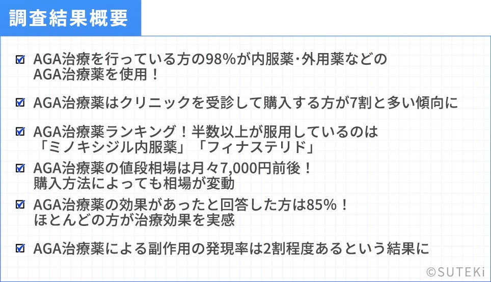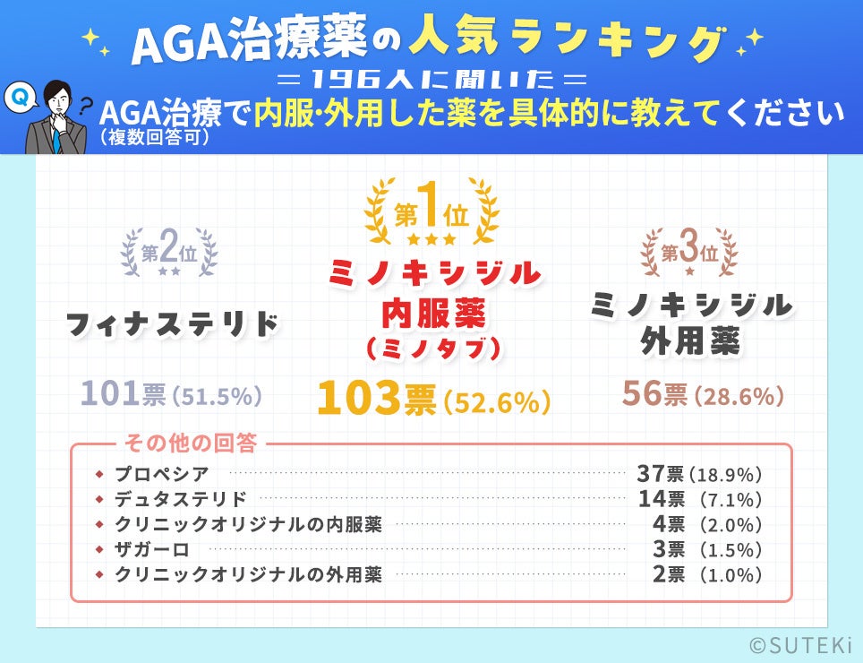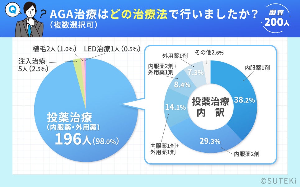 AGA治療・薄毛治療に関する総合情報サイトを運営している株式会社SUTEKi(https://menu.wpx.jp/)では、AGA治療の経験がある男性200名へアンケート調査を実施し、内服薬・外用薬などの「AGA治療薬」を用いた投薬治療について詳しく分析しました。
