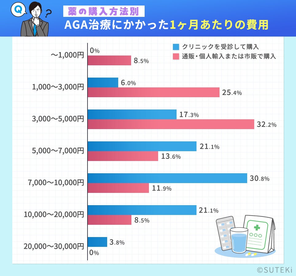 また、AGA治療薬の購入方法別に1ヶ月あたりの治療費用をリサーチしたところ、クリニックで購入した方の半数以上が月々5,000円~10,000円、通販・個人輸入または市販で購入した方の半数以上が月々1,000円~5,000円と回答しており、AGA治療薬の値段相場に差があることが分かりました。