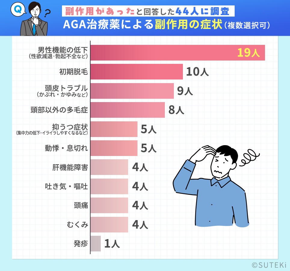 また、AGA治療薬による副作用があったという44人を対象に、具体的にどのような副作用が見られたかを質問すると、「男性機能の低下」「初期脱毛」などが比較的多く回答されており、その他の副作用の症状が現れた方はAGA治療を行った192人中10人未満でした。