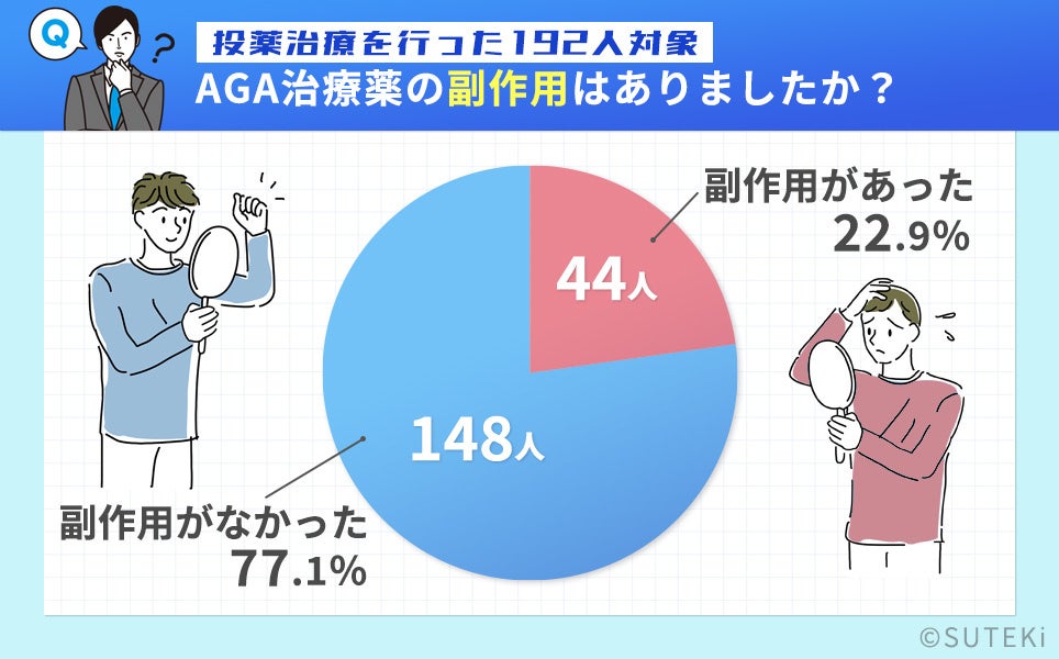 AGA治療を行う中で内服薬・外用薬による副作用があったかどうかを尋ねたところ、副作用があったと回答した方が22.9%、副作用がなかったと回答した方が77.1%という結果になりました。