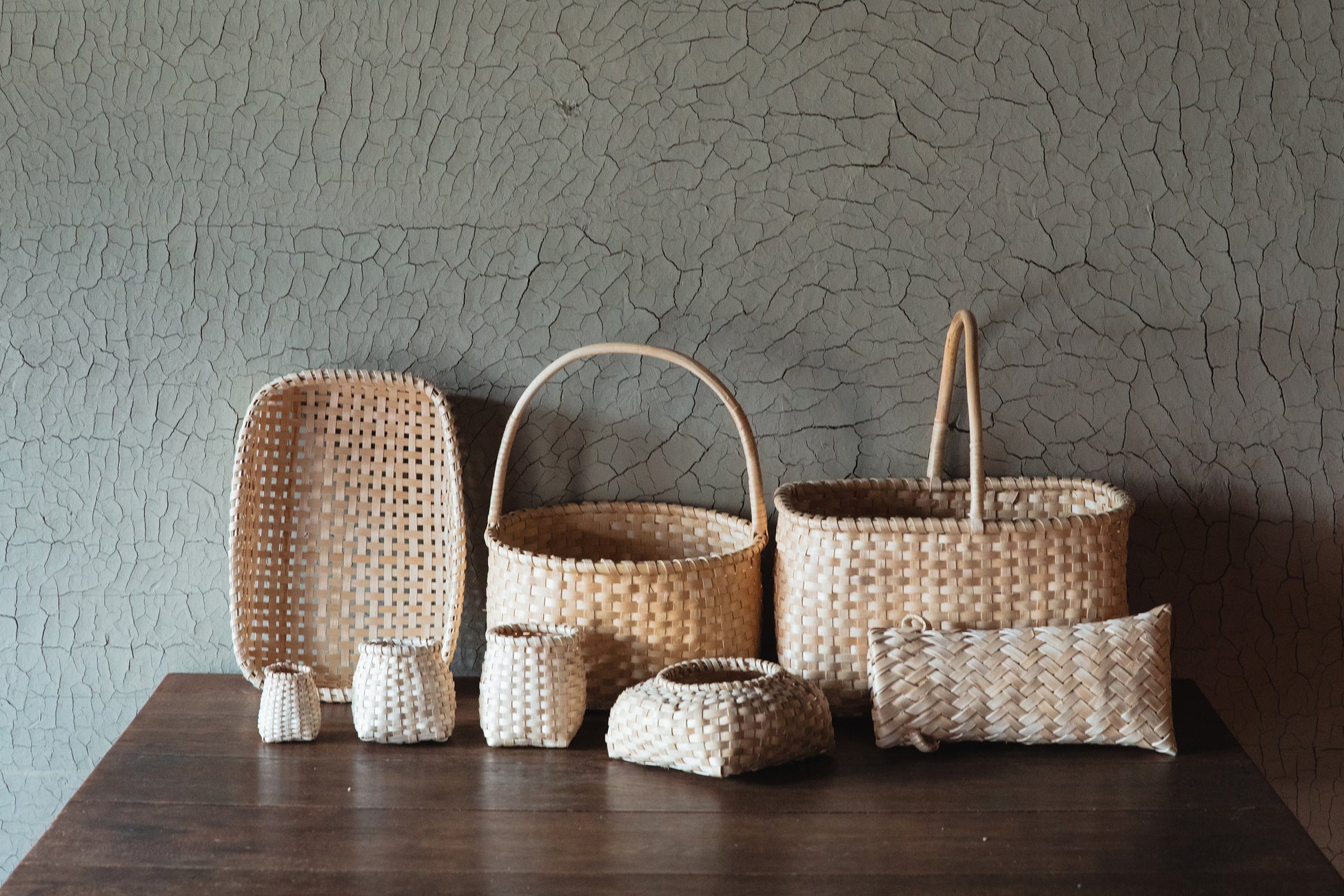 滋賀県長浜市余呉町。森林面積が92%というこの町の奥に、かつて人々の営みがあった「小原村」が静かに眠っています。今では離村集落となったその村で、長い年月を経て受け継がれてきた伝統民具「小原かご」。イタヤカエデの若木を丁寧に割いて編み上げる、厳しい雪国の暮らしの中から生まれた美しい木かごです。丈夫でしなやか、自然の色合いが美しく、生活に密着した道具として親しまれてきました。