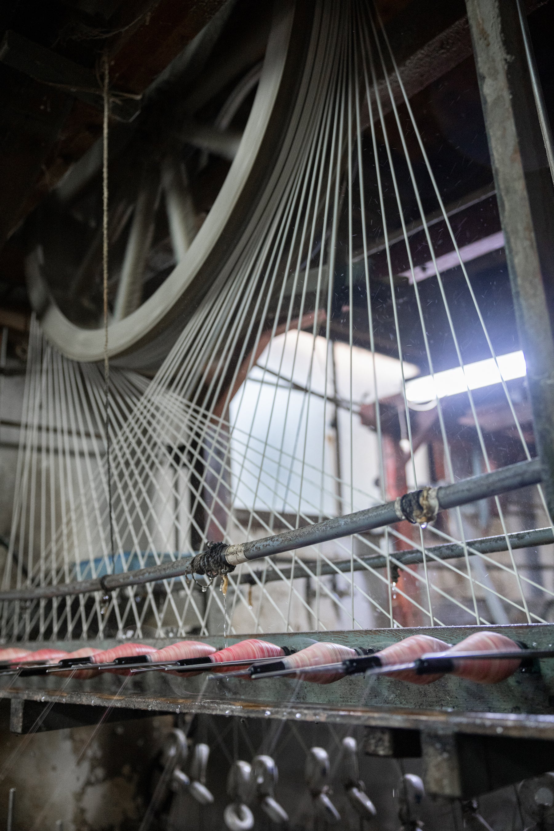丸仙のちりめんは、繭から丁寧に引いた高品質な絹糸を強いよりをかけて織り上げ、その後に精練(せいれん)・加工を施して独特のシボ(凹凸)を生み出します。生糸1本から織り上がるまですべての工程を自社工場で一貫して行い約20の工程を、昔ながらの製法と熟練の手仕事で丁寧に仕上げています。シルクのみを使用した『古代二越(ふたこし)ちりめん』で織り方に特徴があり、一般的なちりめんに比べ強度とボリュームがあり、主に風呂敷やふくさに使用される高級なちりめんです。生地表面のシボが大きなちりめんは『鬼シボちりめん』と言われています。
